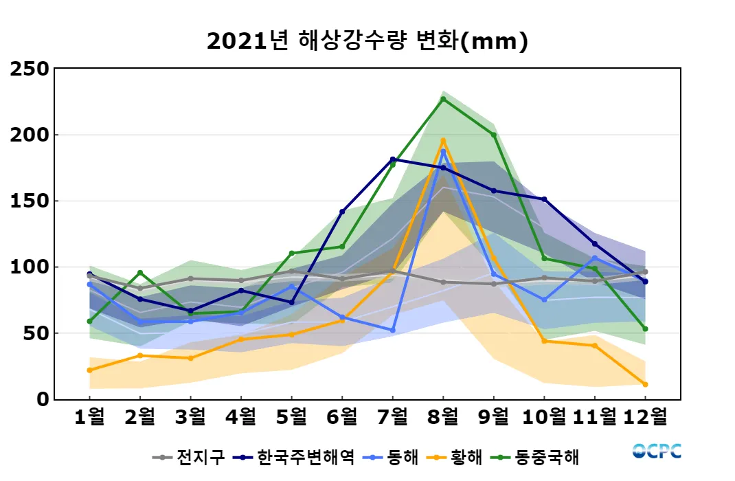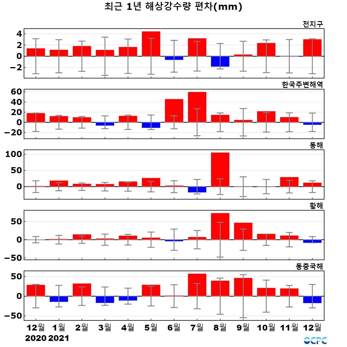 전지구, 한국주변해역, 동해, 동중국해의 12월 해상강수량은 평년과 비슷했으며, 황해는 평년보다 적었습니다.