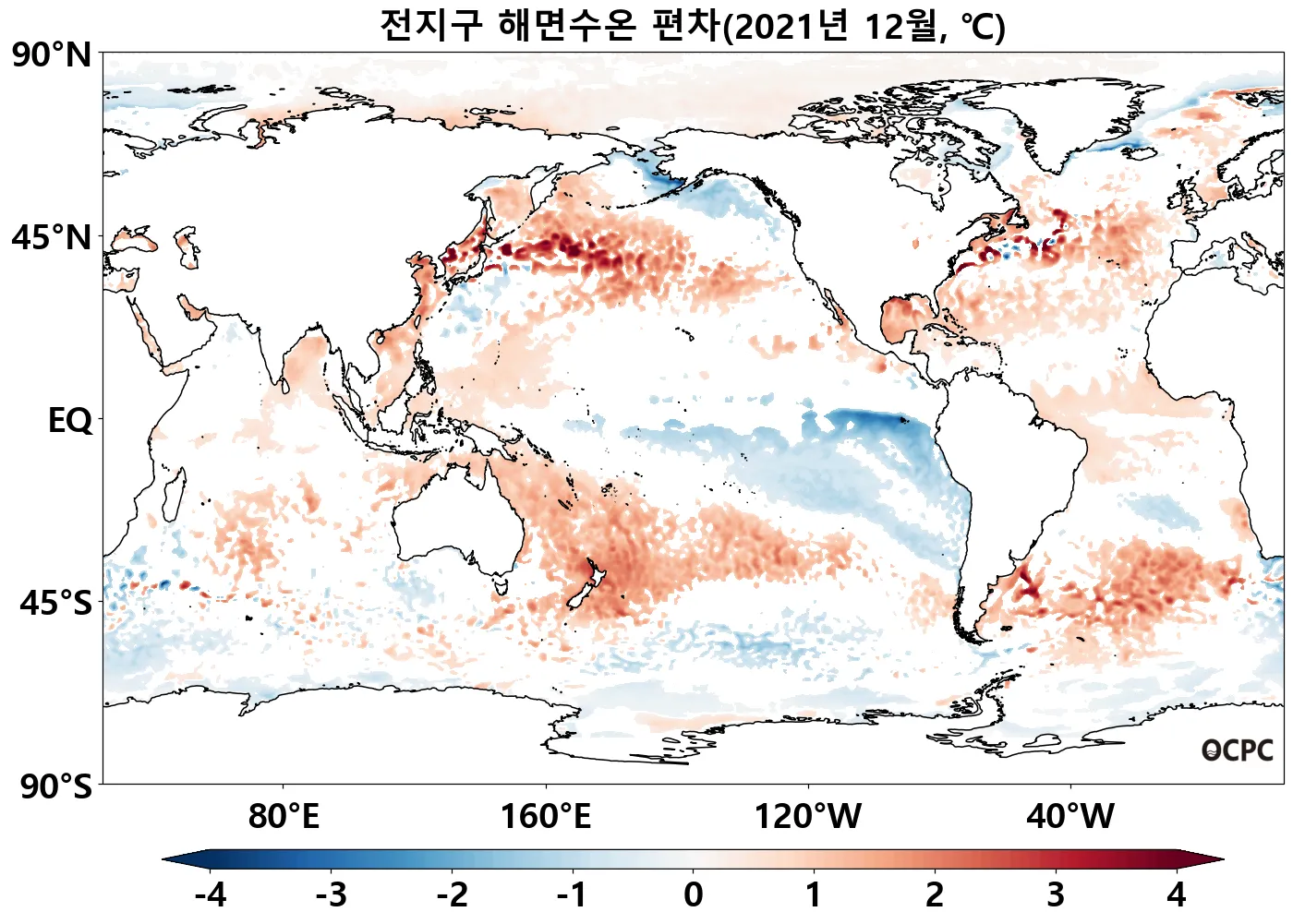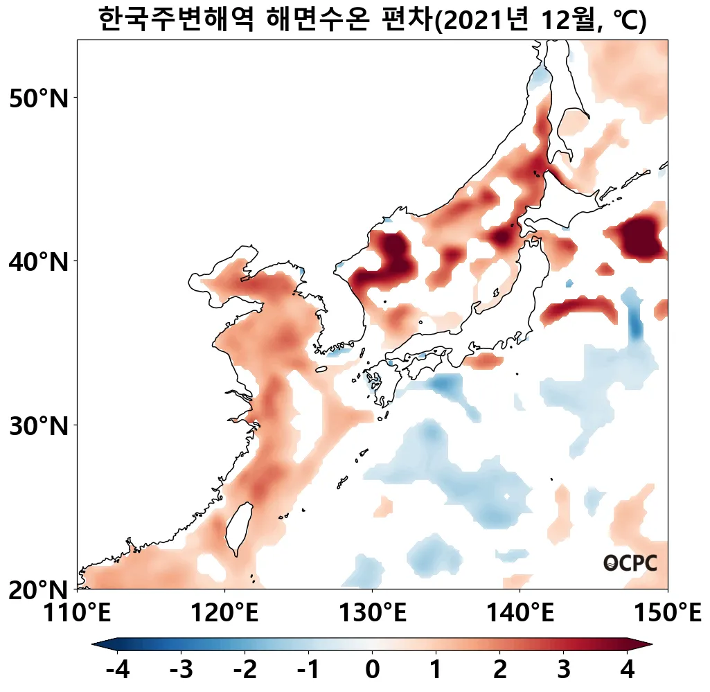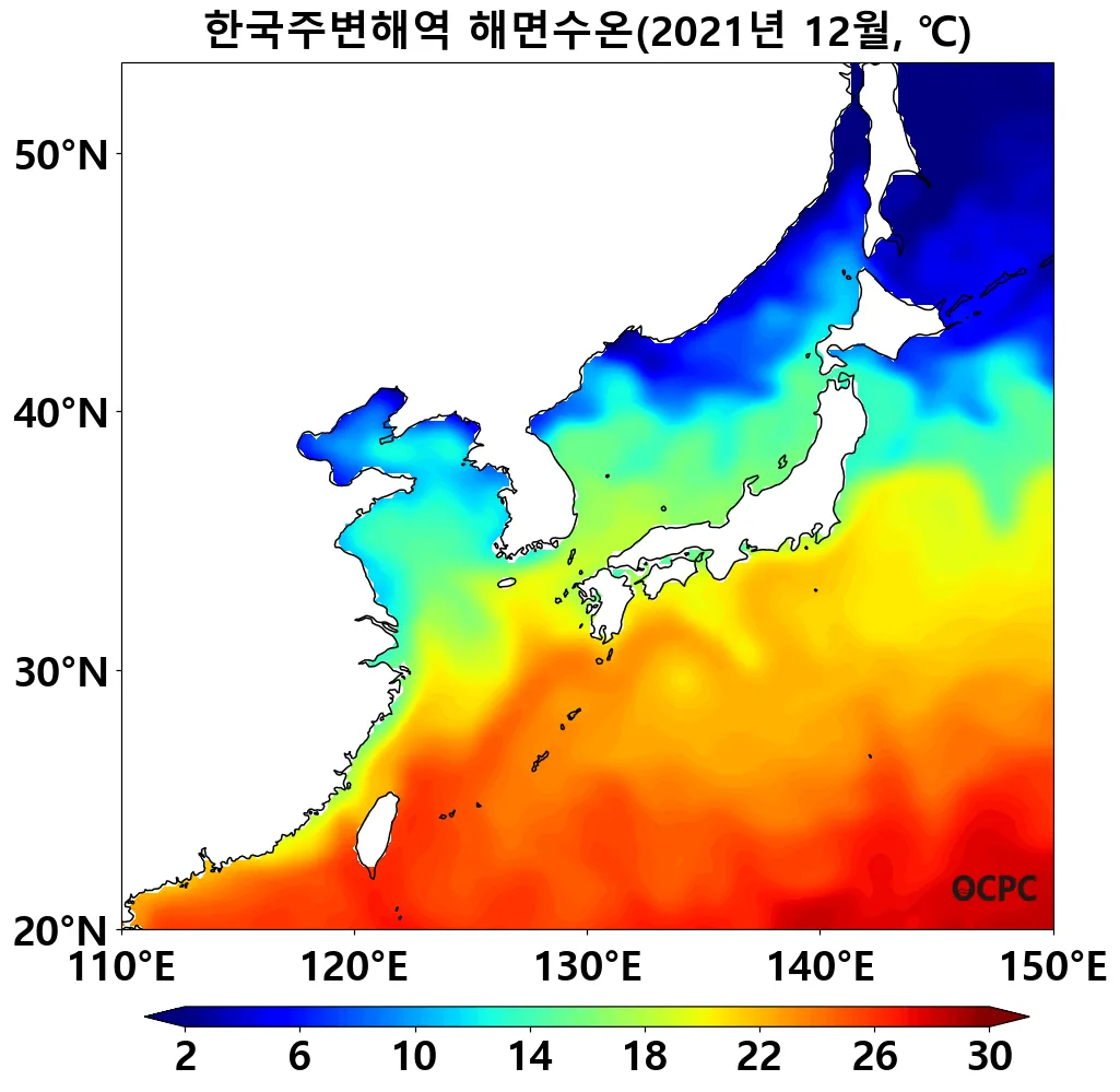 전지구 및 한국주변해역 평균 해면수온은 평년보다 높았으며, 특히 동해와 동중국해는 지난 30년 12월 중 가장 높았습니다.