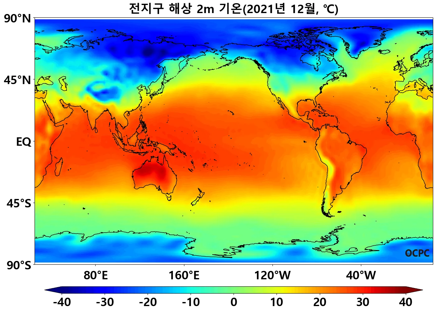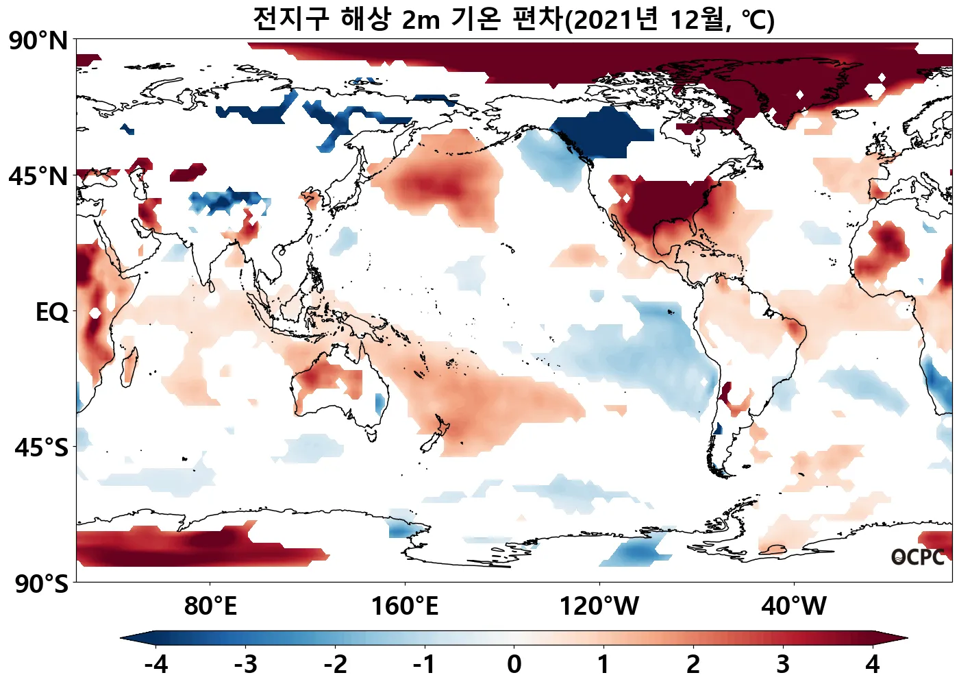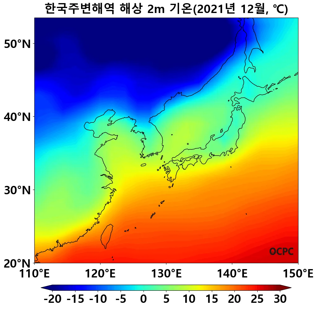 전지구 및 한국주변해역 평균 해면수온은 평년보다 높았으며, 특히 동해와 동중국해는 지난 30년 12월 중 가장 높았습니다.
