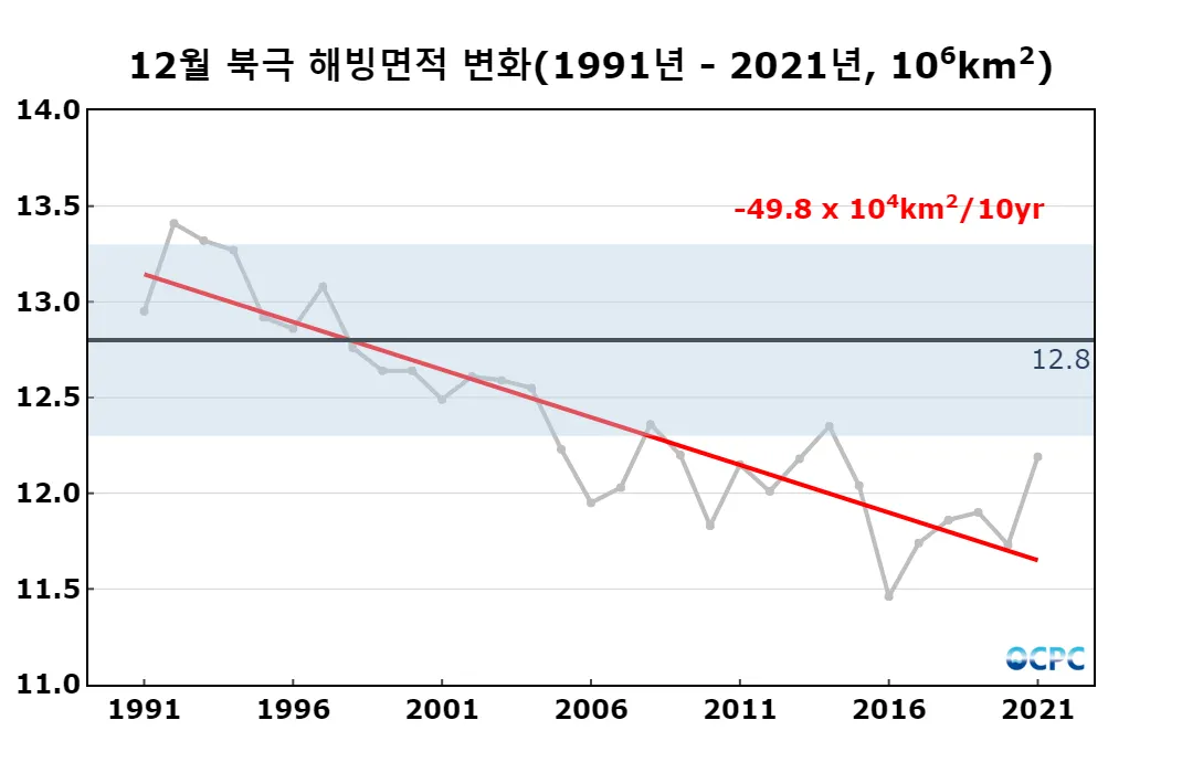 최근 30년 동안 12월 북극 해빙면적의 경향은 10년에 49.8만km² 정도의 감소 추세에 있습니다.