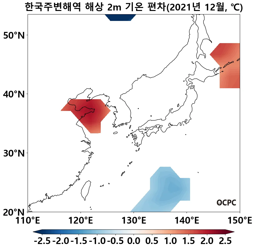 동해, 동중국해의 해상기온은 평년(1.5°C, 14.7°C)과 비슷했으며, 황해는 평년(4.3°C)보다 1.5°C 높았습니다.