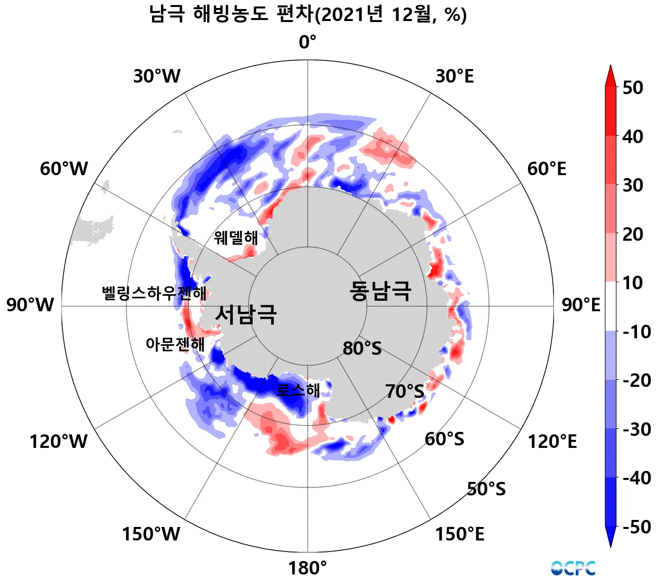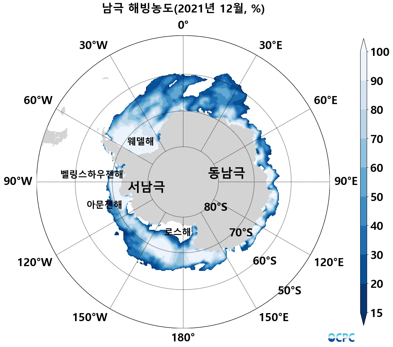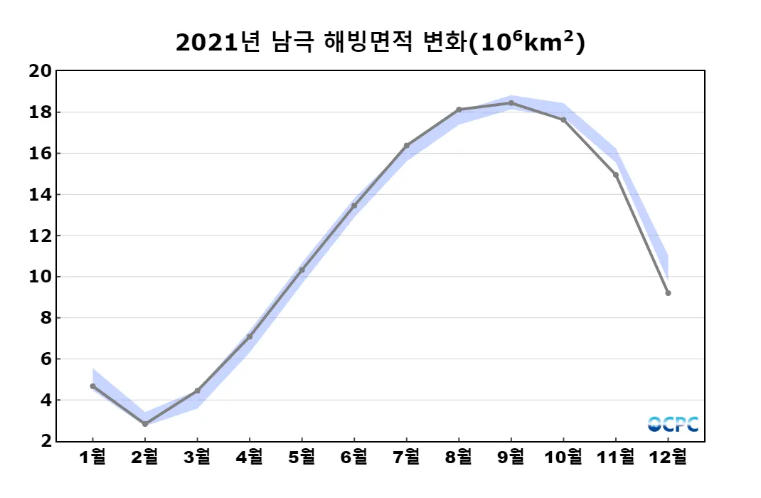 남극 해빙면적은 920만km²로 평년(1,041만km²)보다 121만km²(11.6%) 작았습니다.