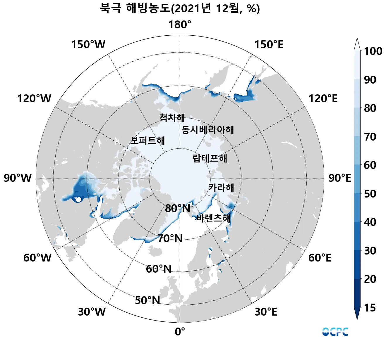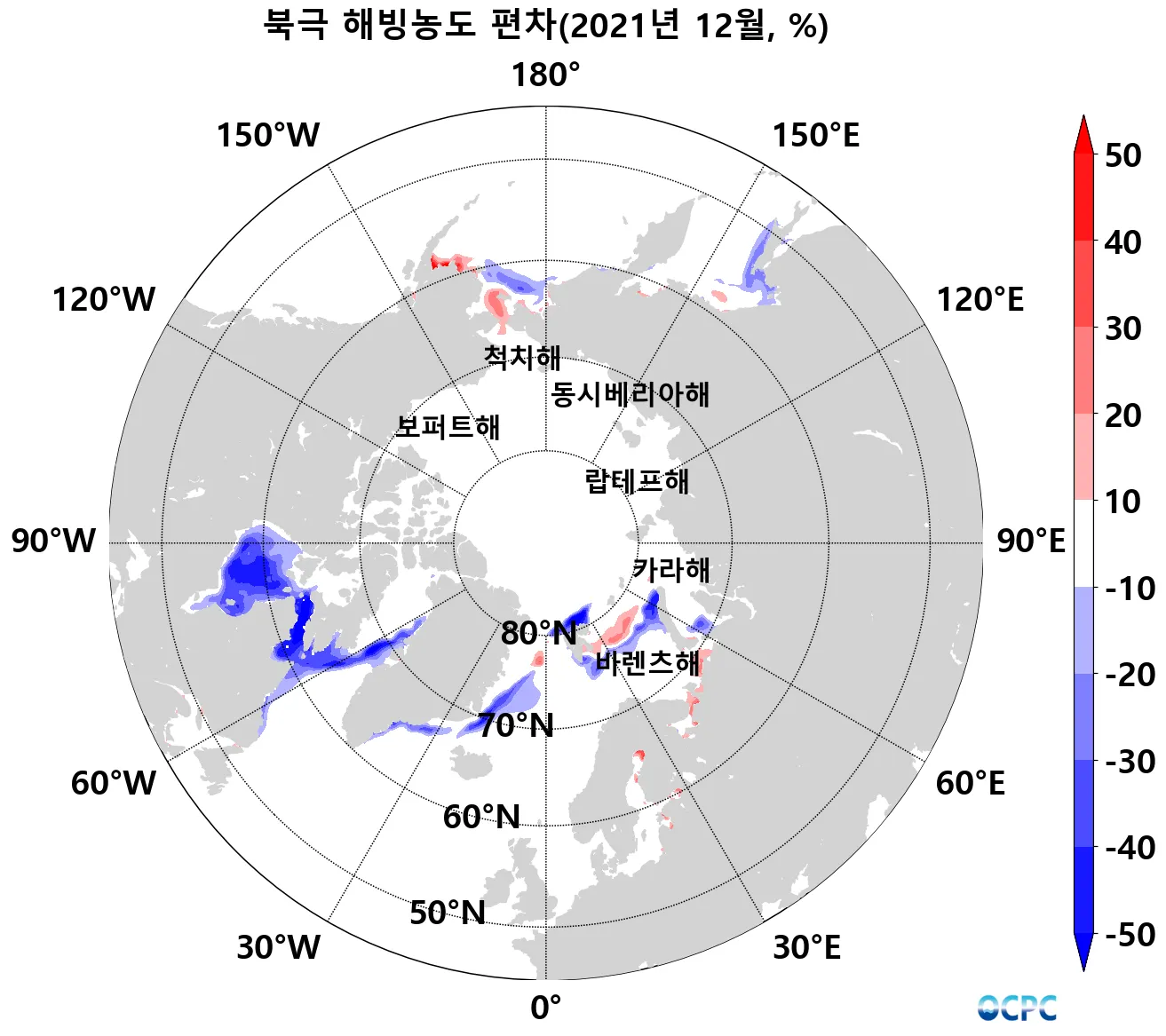 공간적으로는 북미 허드슨만 일대와 그린란드 인근의 해빙면적 감소가 평년보다 컸습니다.