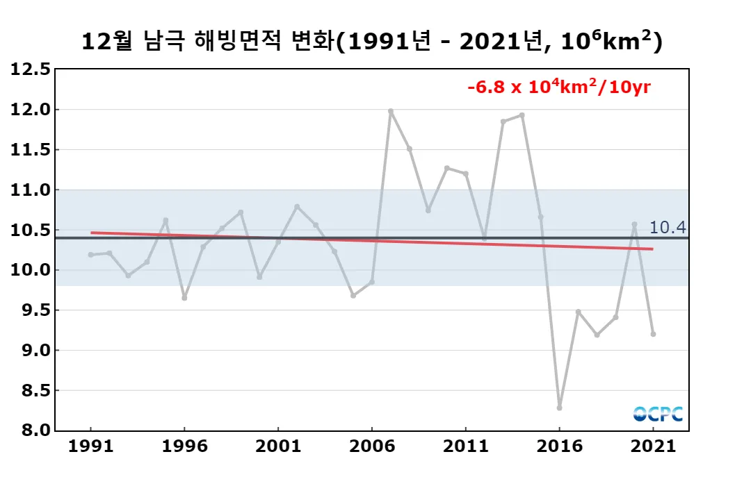최근 30년 동안 12월 남극 해빙면적 변화 경향은 10년에 6.8만km² 정도로 감소 추세입니다.