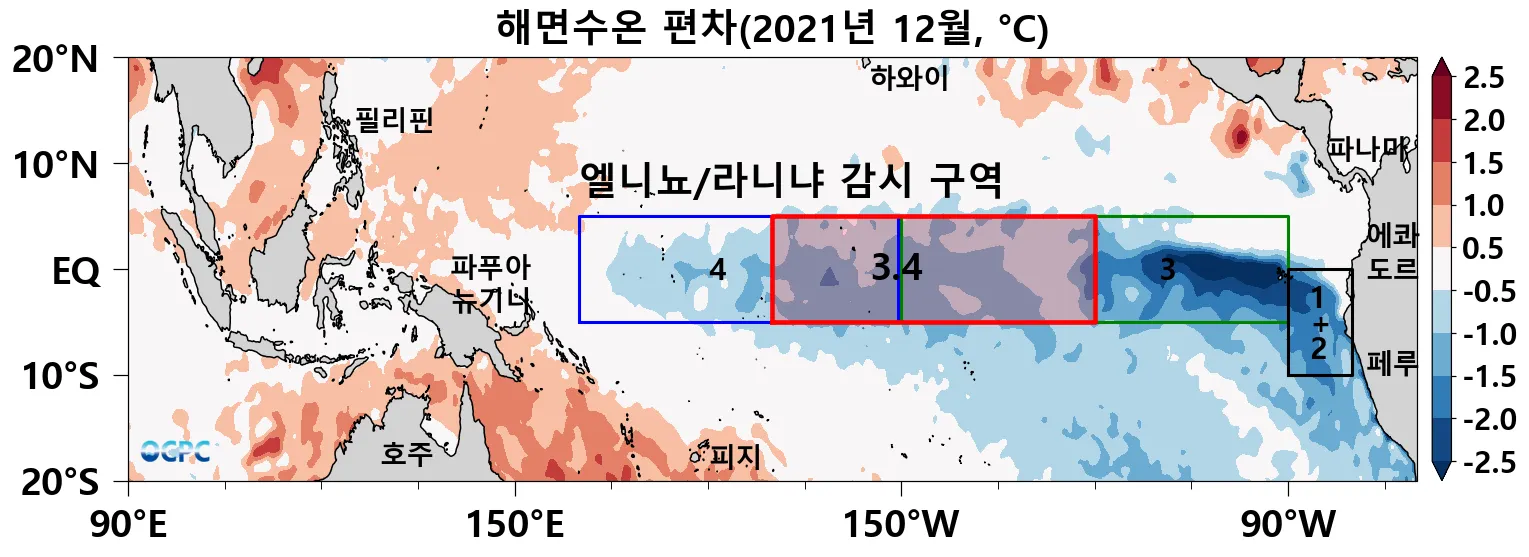 엘니뇨/라니냐 감시구역인 열대태평양 Nino3.4 해역(5°S~5°N, 170°W~120°W)의 12월 평균 해면수온 편차는 라니냐에 해당합니다.