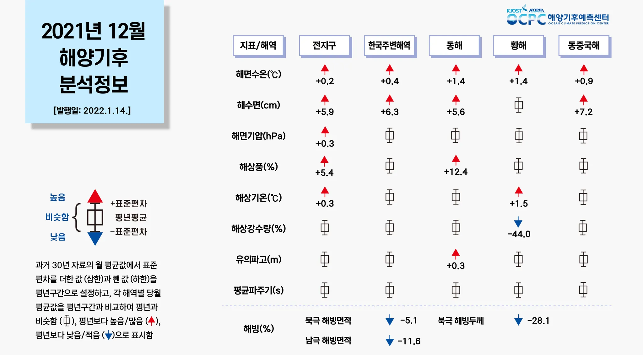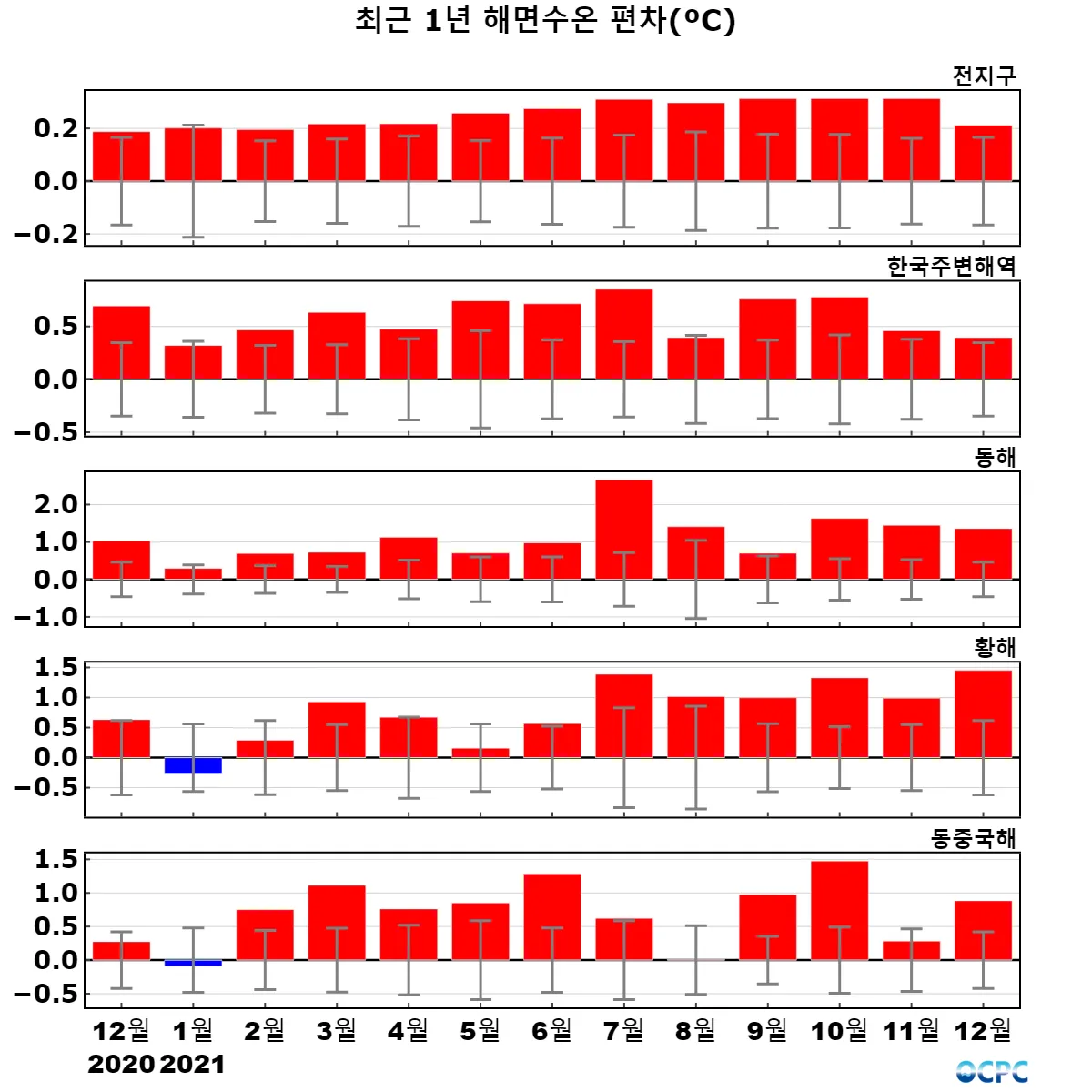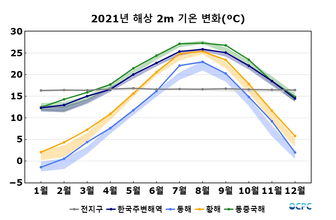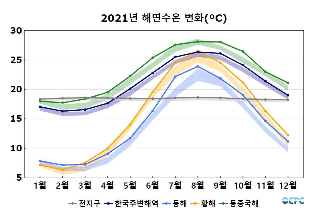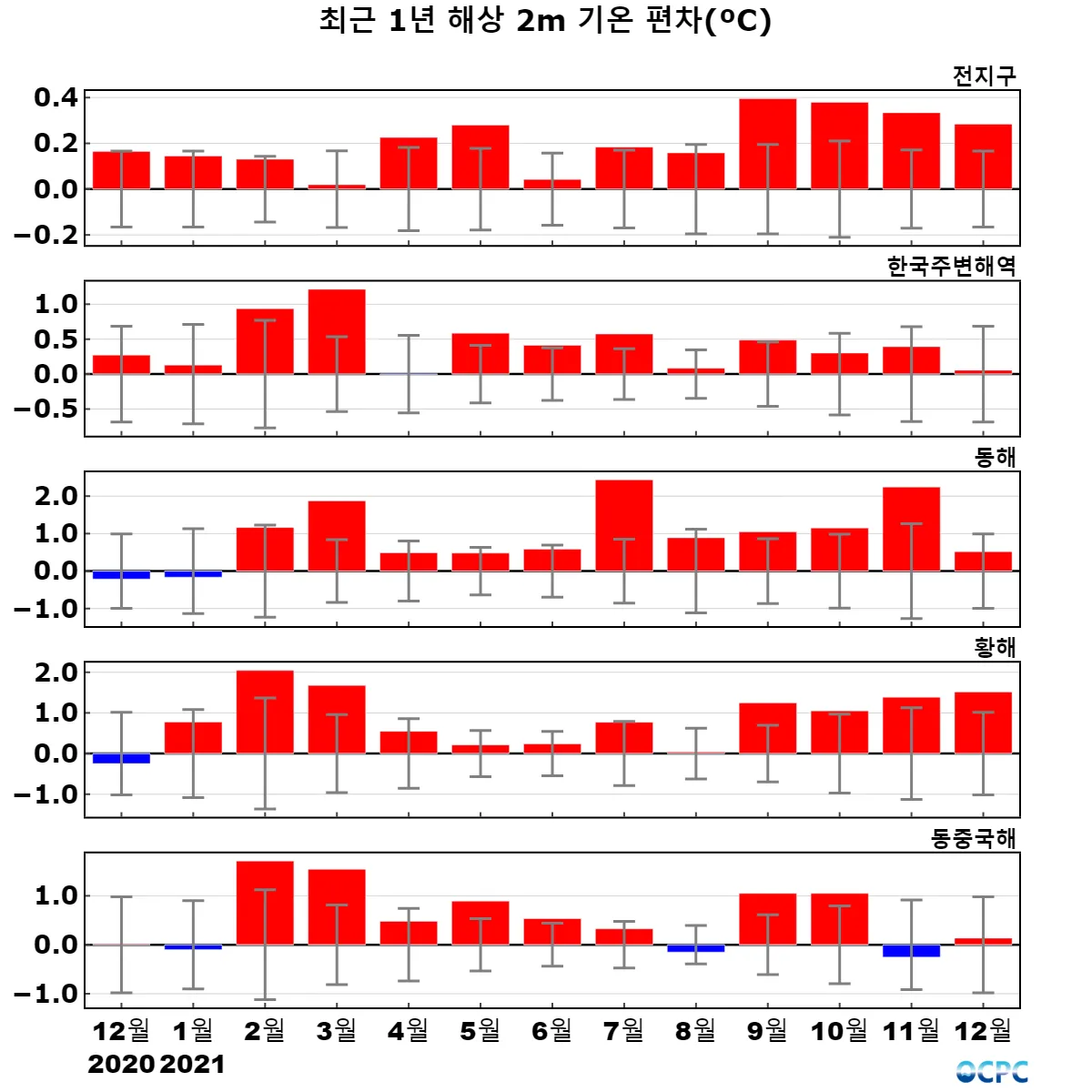 전지구, 황해의 해상기온은 평년보다 높았으며, 한국주변해역, 동해, 동중국해는 평년과 비슷했습니다.