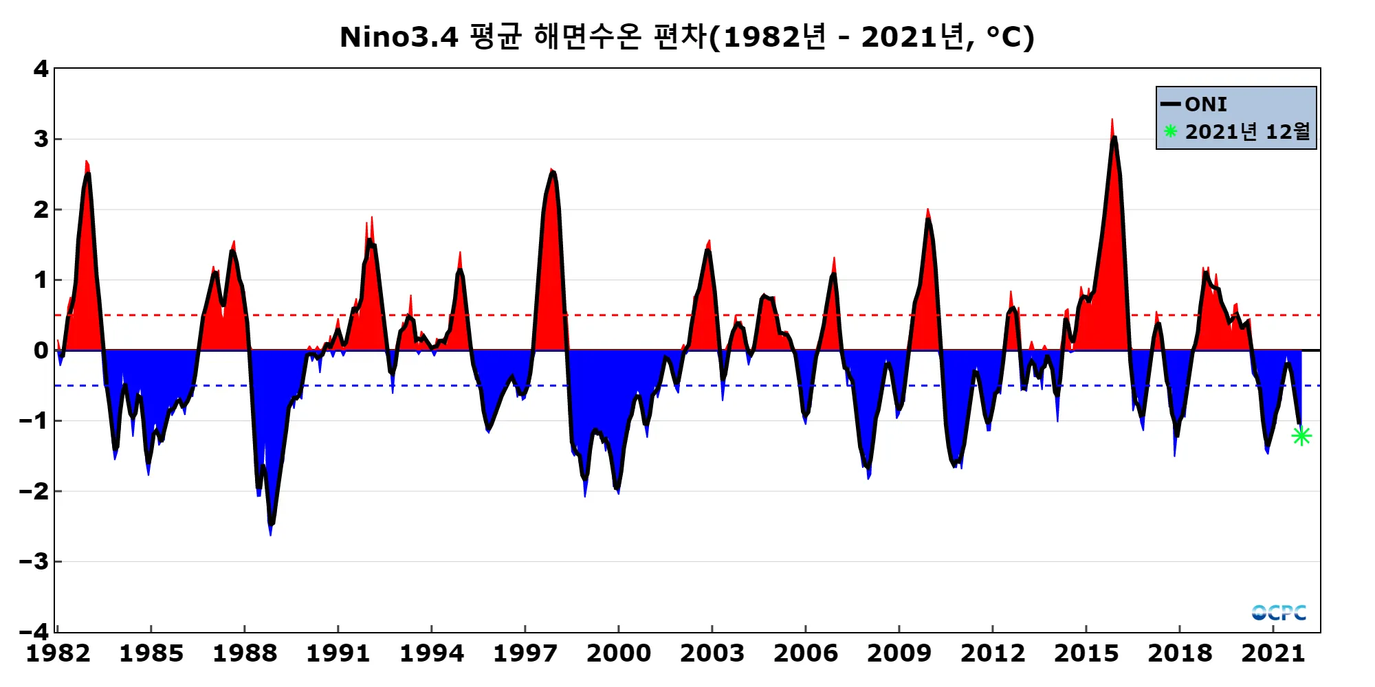 ONI (Ocean Nino Index): 엘니뇨/라니냐 감시구역인 Nino3.4 해역의 월평균 해면수온 편차(채색부분)를 3개월 이동평균하여 나타낸 지수(검정선)로 0.5보다 크면 엘니뇨, -0.5보다 작으면 라니냐로 판정합니다.