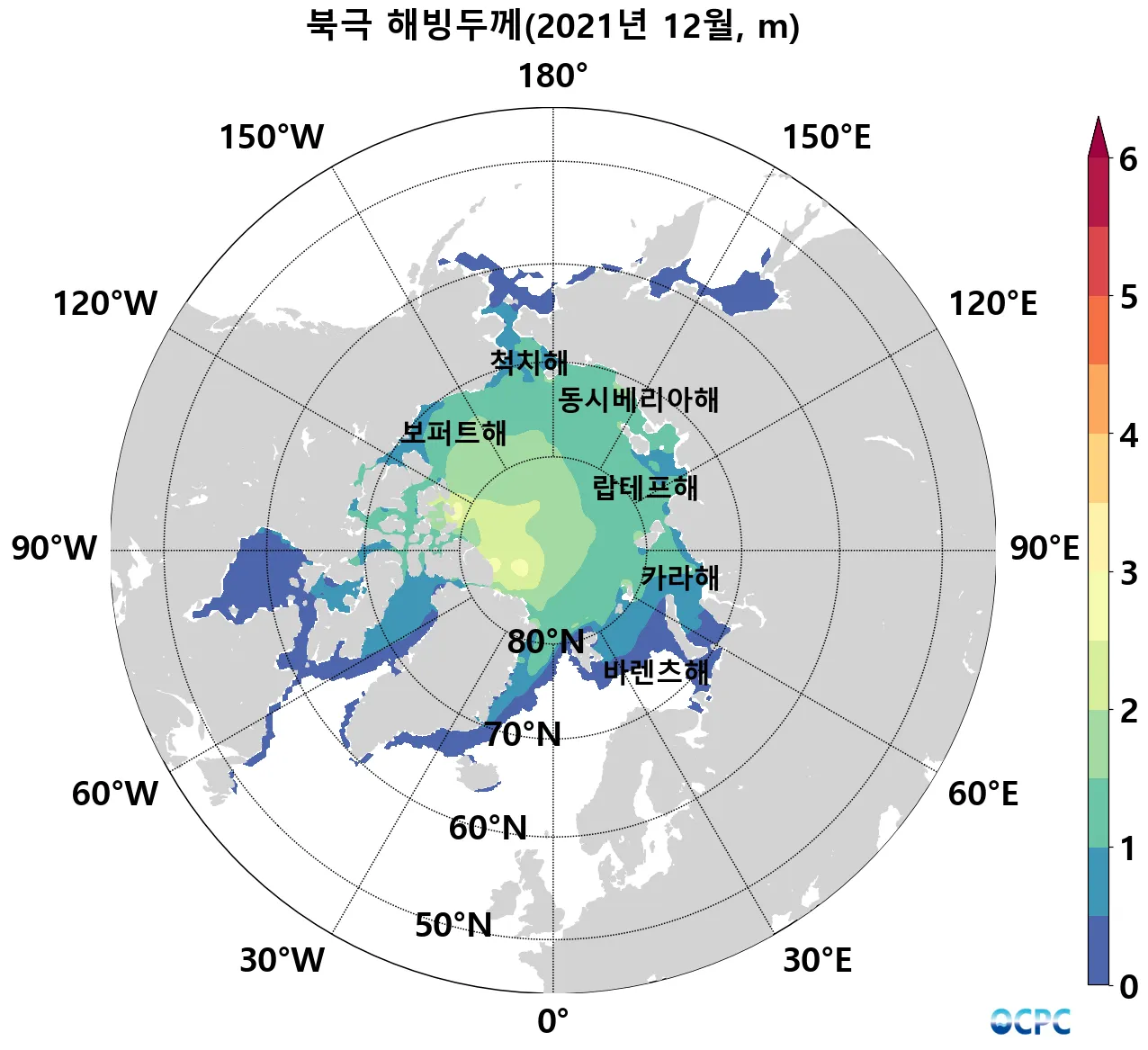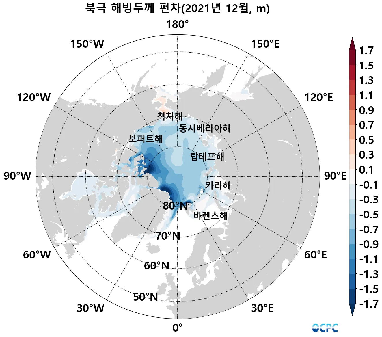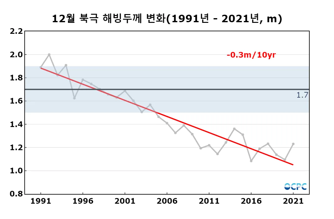 북극 해빙두께는 평년(약 1.7m)보다 약 0.5m(28.1%) 얇았으며, 최근 30년 동안 10년에 약 0.3m씩 얇아지는 추세입니다.