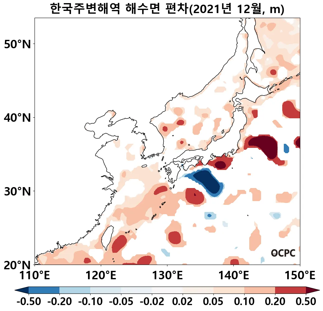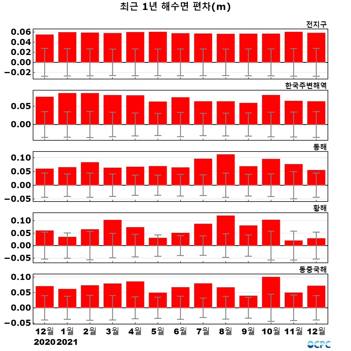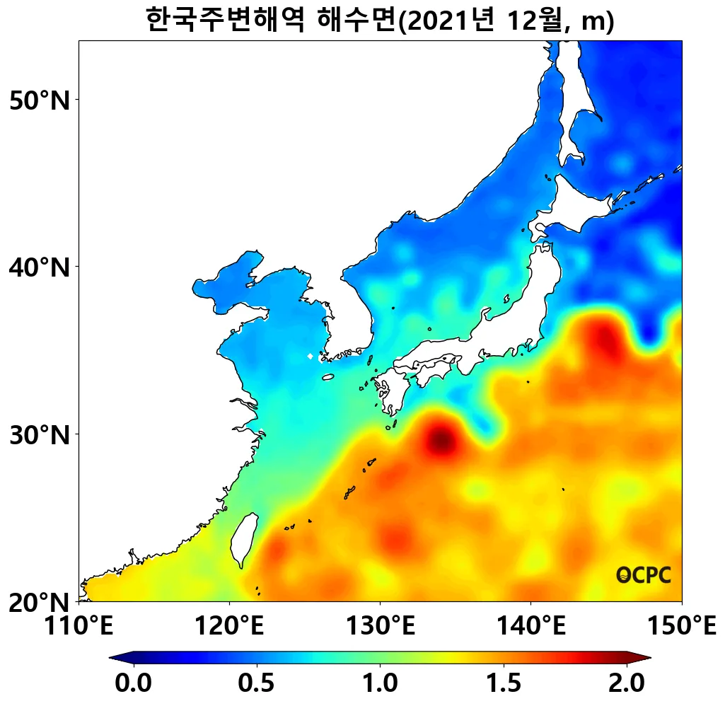 최근 28년 동안 12월의 전지구와 한국주변해역의 해수면은 10년에 3.4~3.6cm씩 상승하는 추세이며, 동해, 황해, 동중국해의 상승률은 3.3~4.0cm입니다.