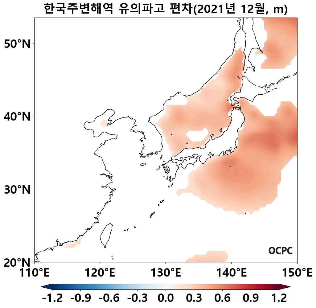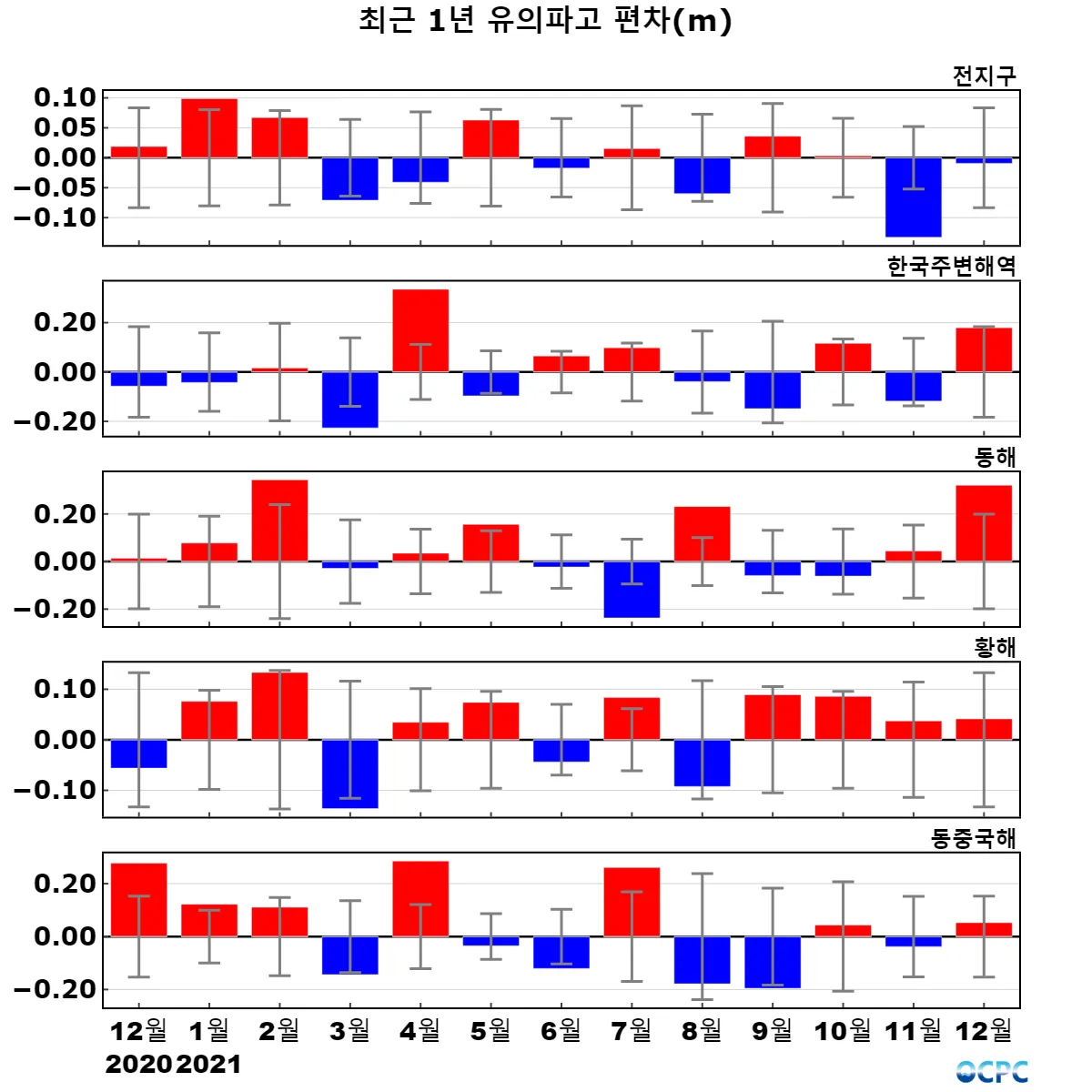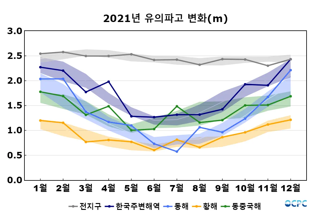 전지구, 한국주변해역, 황해, 동중국해의 평균 유의파고는 평년과 비슷했으며, 동해는 평년보다 높았습니다.