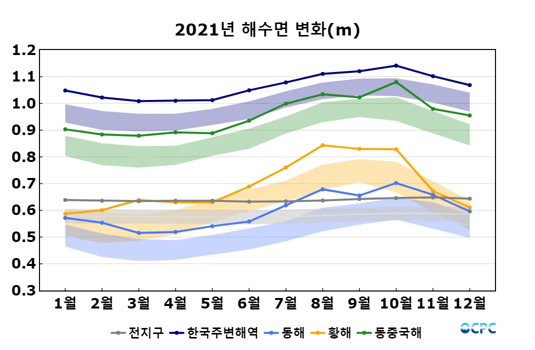 전지구 및 한국주변해역 평균 해수면은 평년보다 높았으며, 황해는 평년과 비슷했습니다.