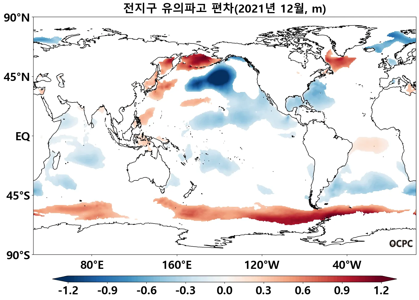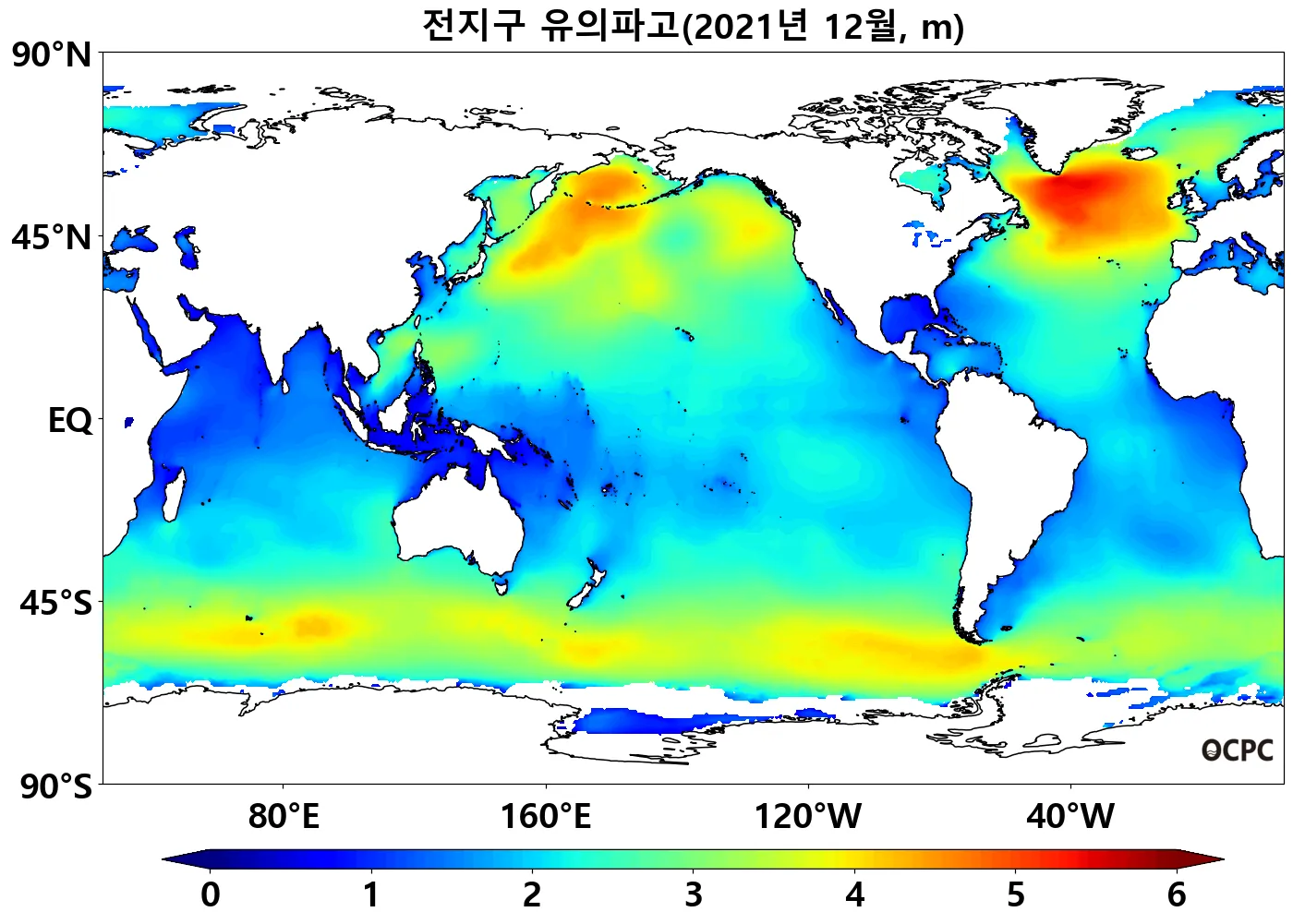 전지구 및 한국주변해역의 평균 유의파고는 평년(2.4m, 2.3m)과 비슷했습니다.