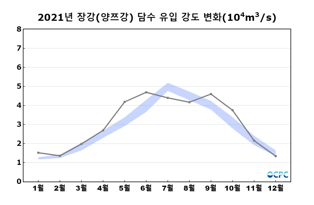 중국 장강(양쯔강)으로부터의 담수 유입량은 평년보다 적었습니다.