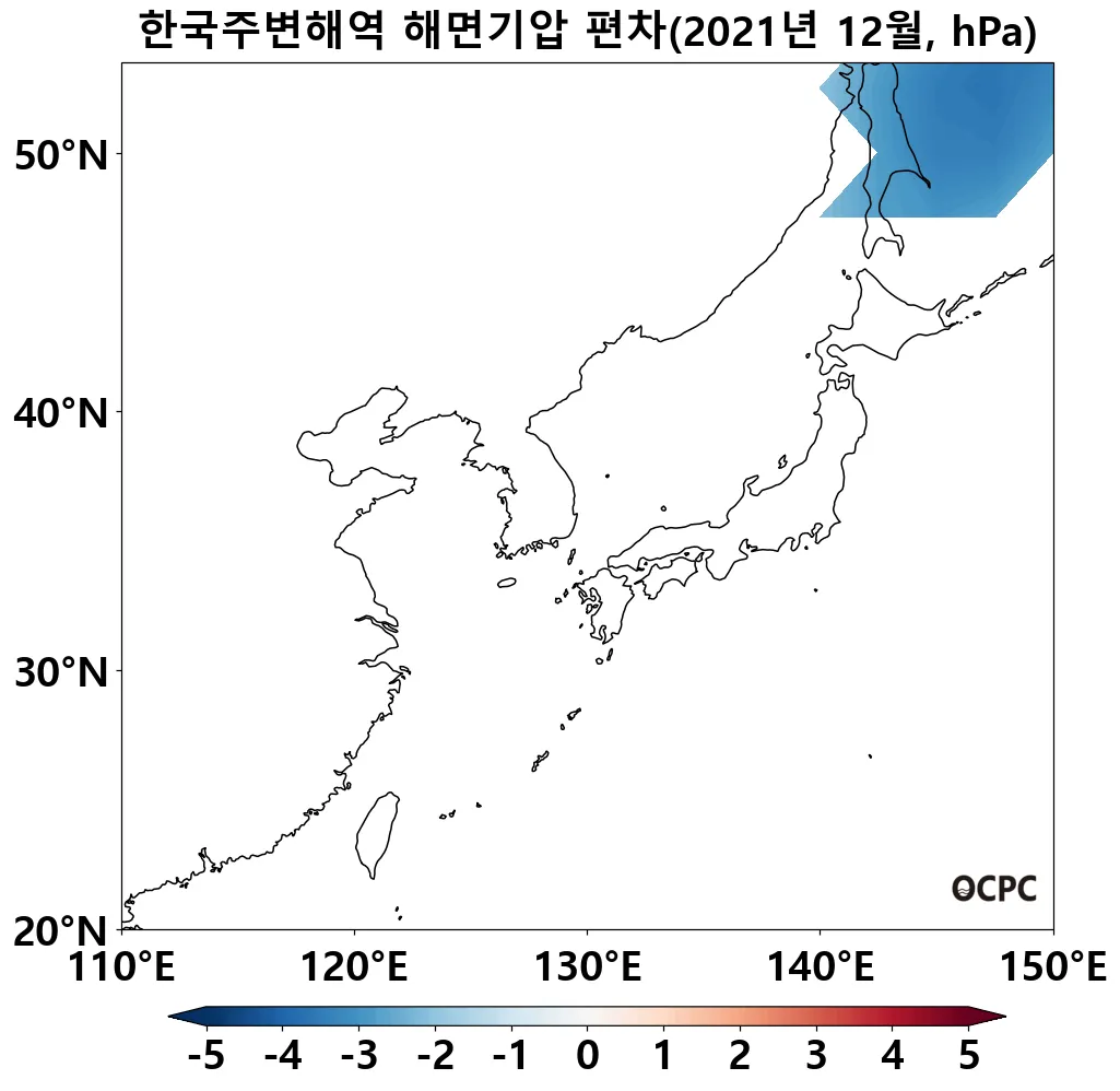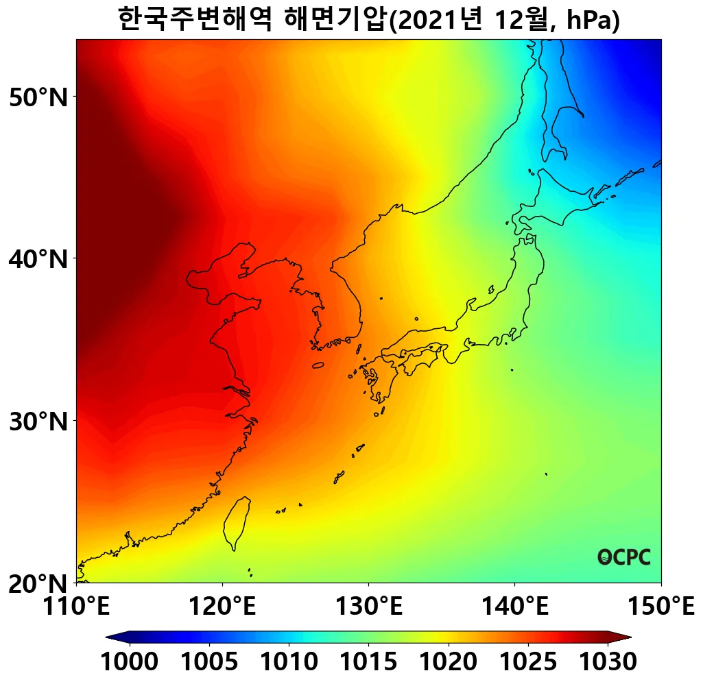 최근 30년 동안 한국주변해역, 동해, 황해, 동중국해의 12월 해면기압은 10년에 0.1~0.6hPa씩 감소하는 추세입니다.