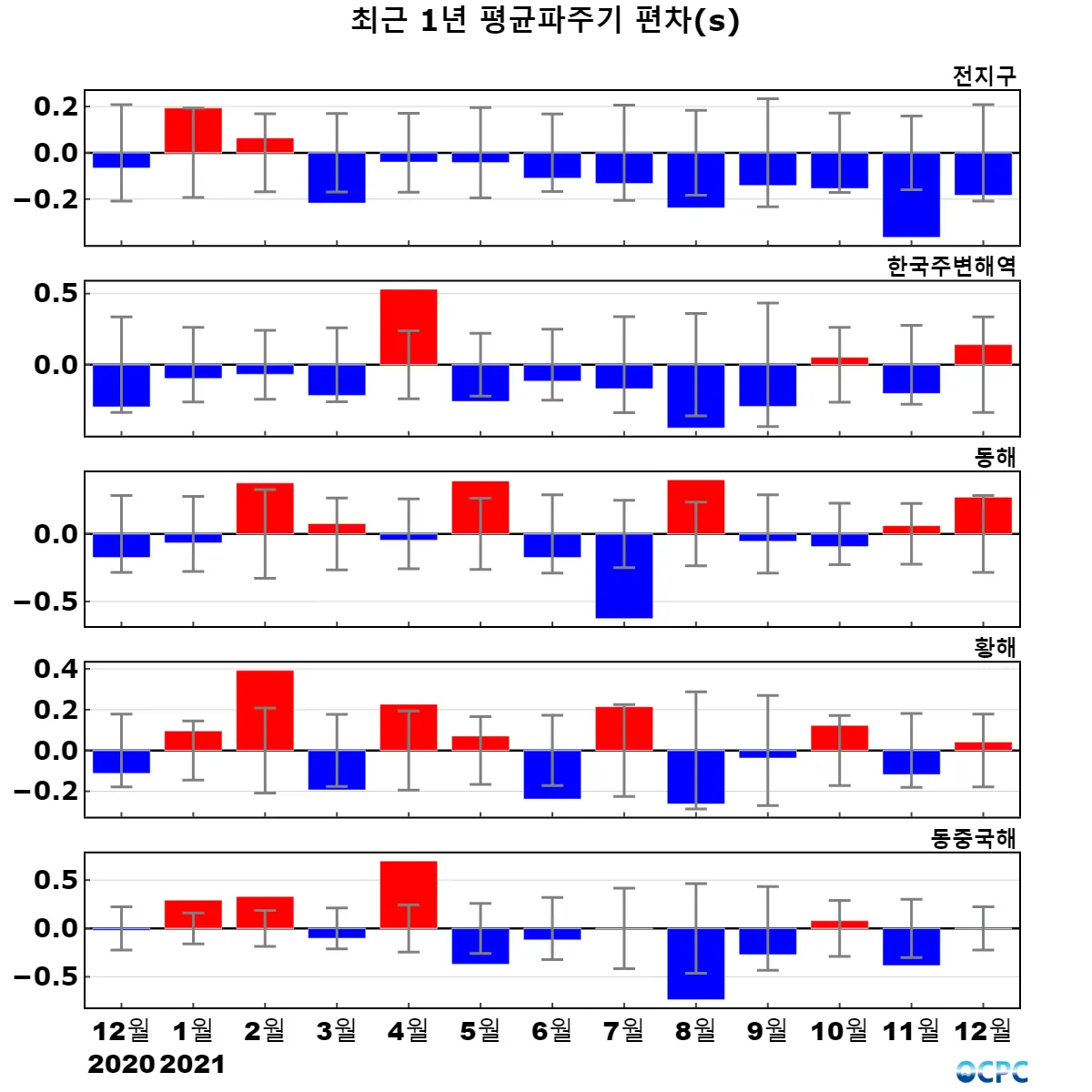 전지구, 한국주변해역, 동해, 황해, 동중국해의 평균파주기는 평년과 비슷했습니다.