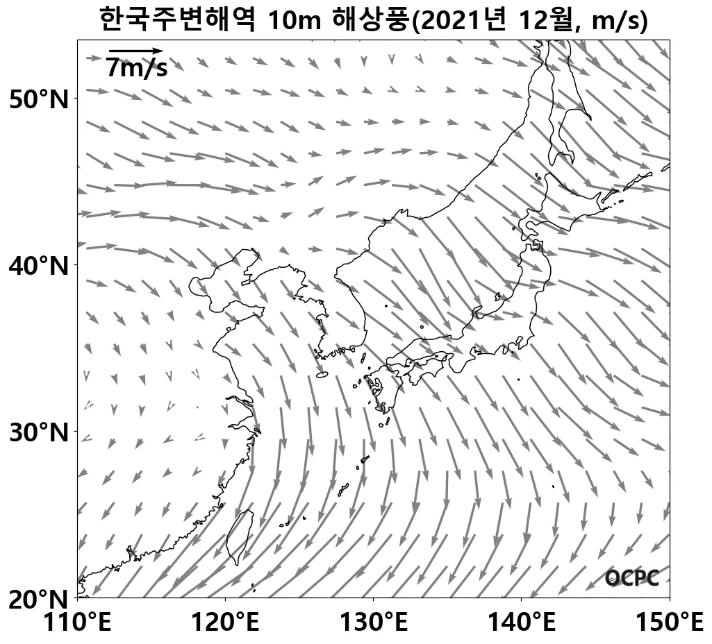 최근 30년 동안 전지구 및 한국주변해역의 12월 해상풍속은 10년에 0.1~0.3m/s씩 증가하는 추세입니다.