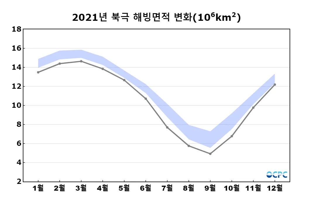 북극 해빙면적은 1,219만km²로 평년(1,284만km²)보다 65만km²(5.1%) 작았습니다.