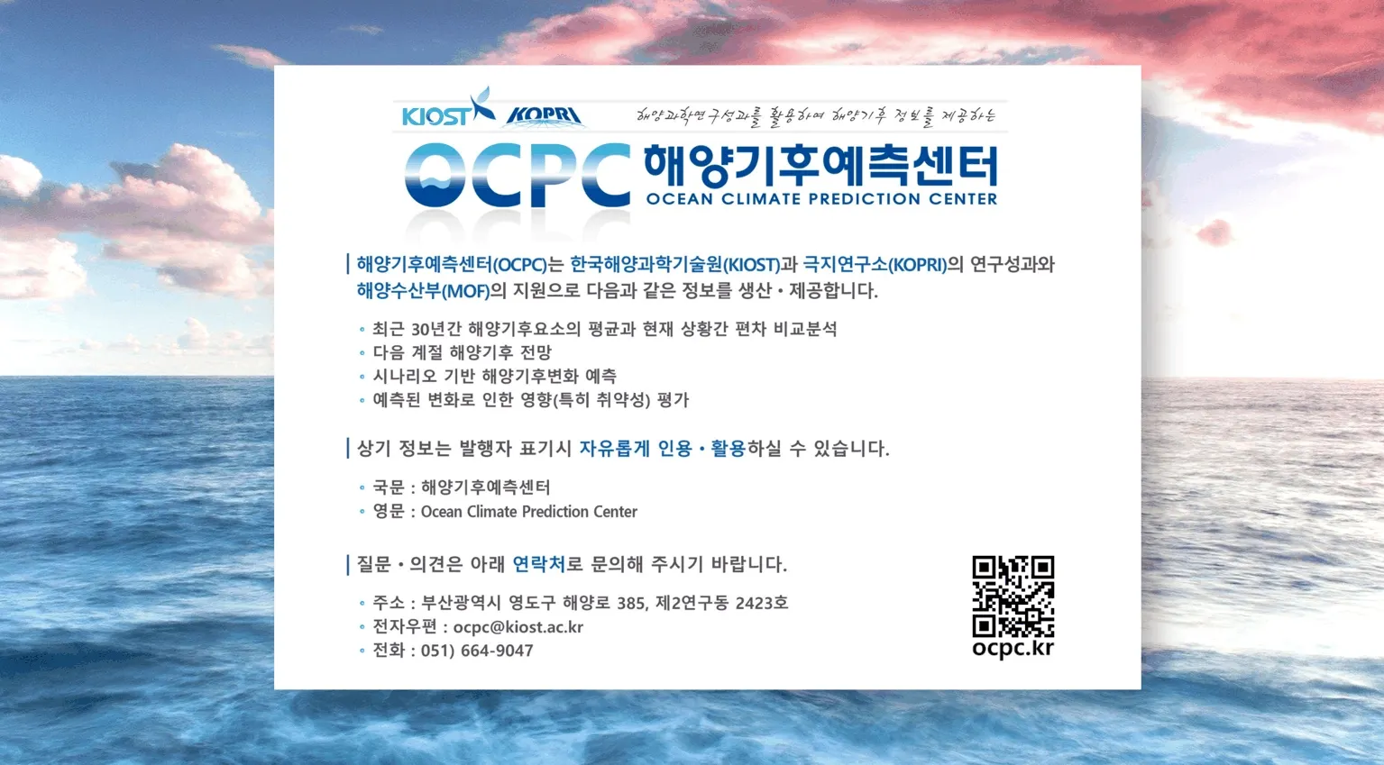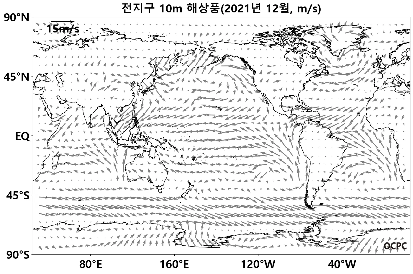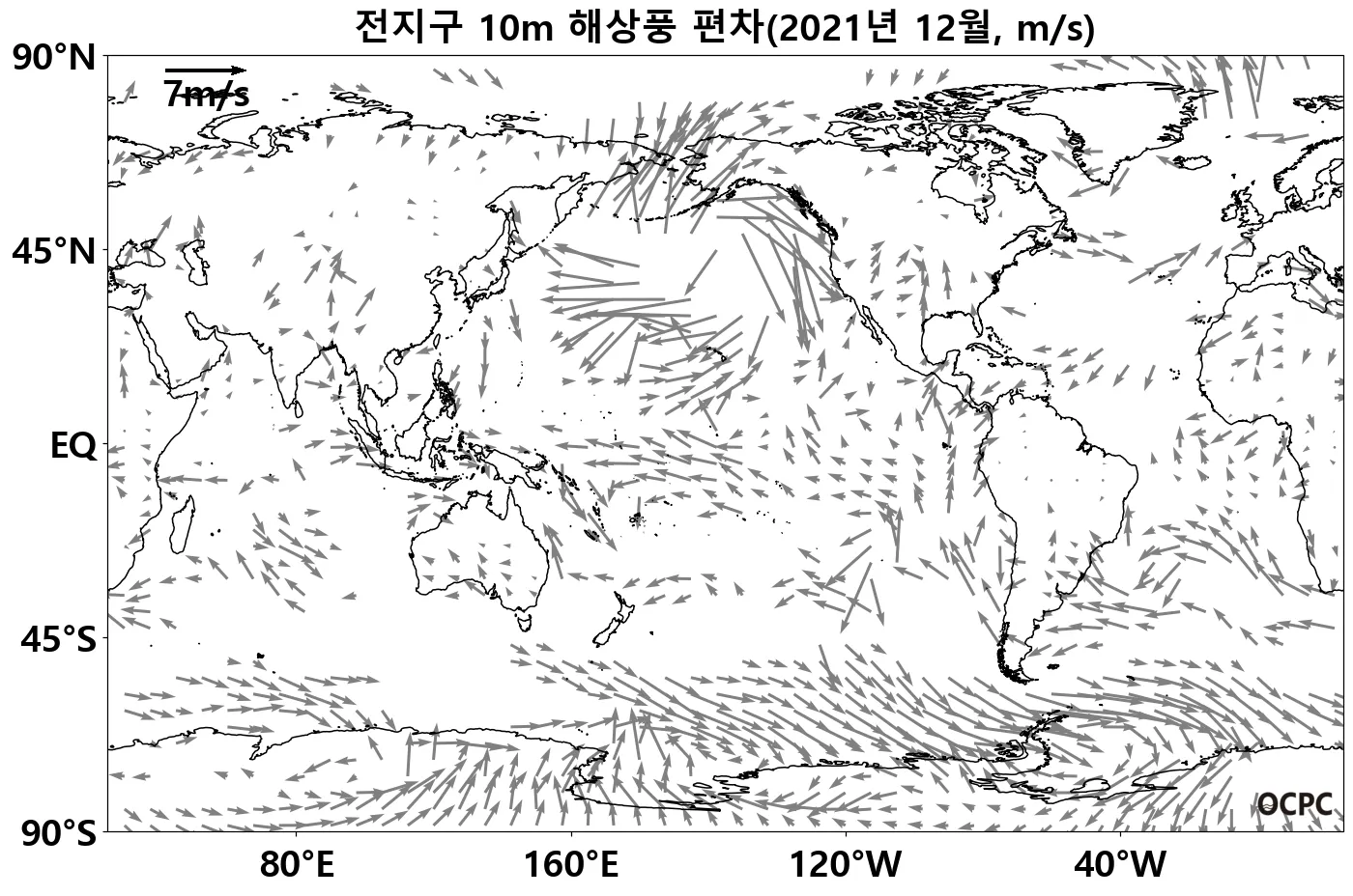 전지구 평균 해상풍속은 평년(4.7m/s)보다 0.3m/s(5.4%) 강했습니다.