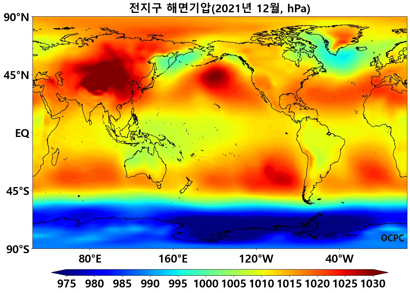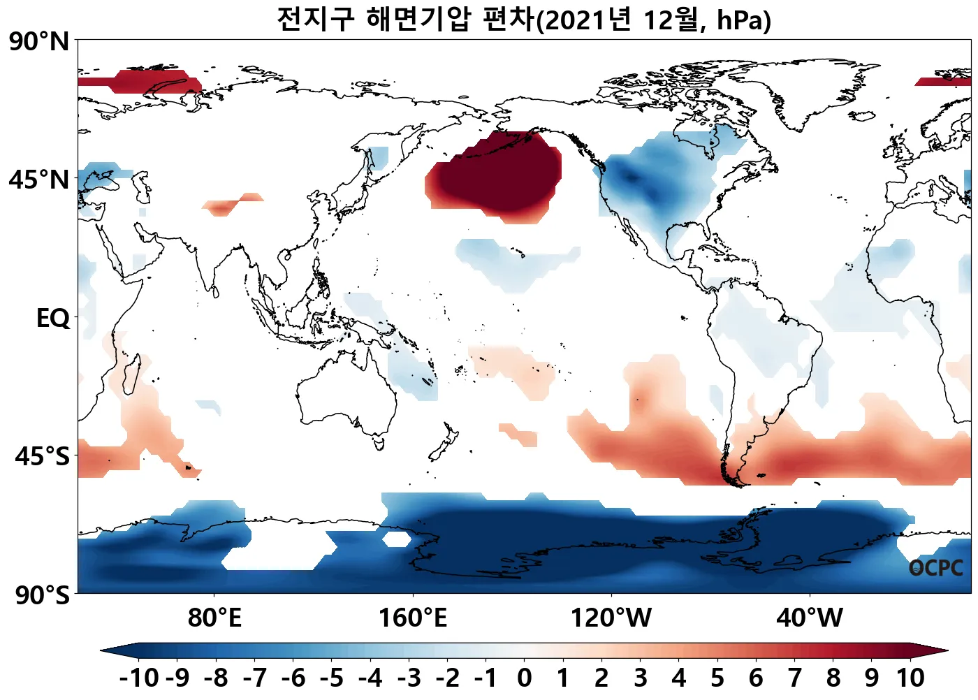 전지구 평균 해면기압은 평년(1010.2hPa)보다 0.3hPa 높았습니다.
