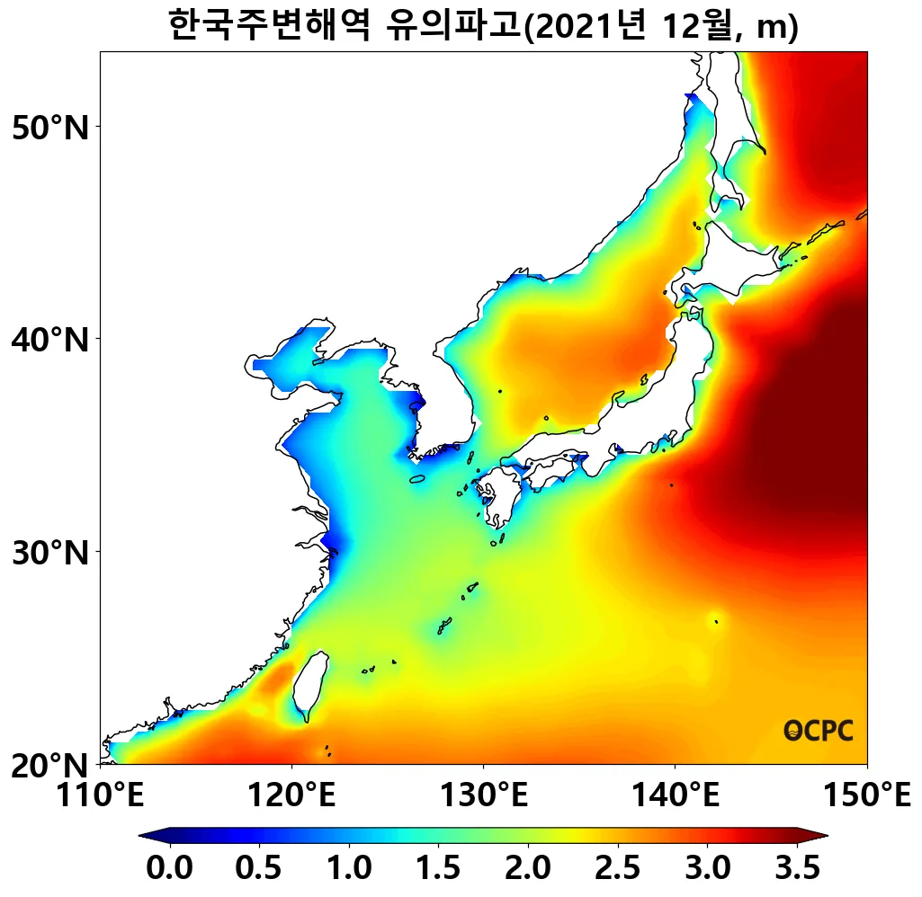 동해의 평균 유의파고는 평년(1.9m)보다 0.3m 높았고, 황해와 동중국해의 평균 유의파고는 평년(1.2m, 1.6m)과 비슷했습니다.