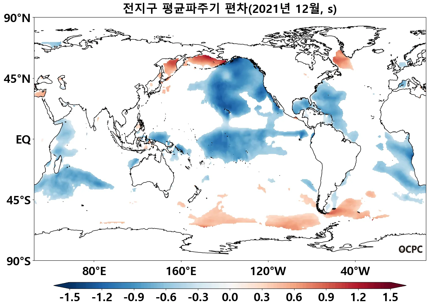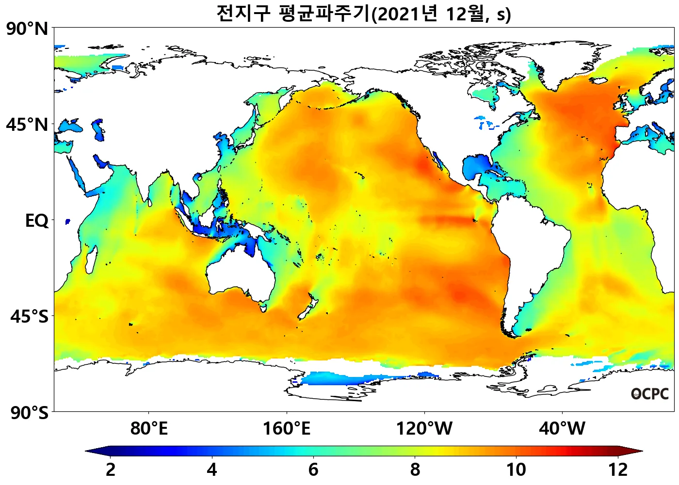 최근 30년 동안 12월의 전지구 및 한국주변해역의 평균파주기는 10년에 0.1초씩 감소하는 추세입니다.