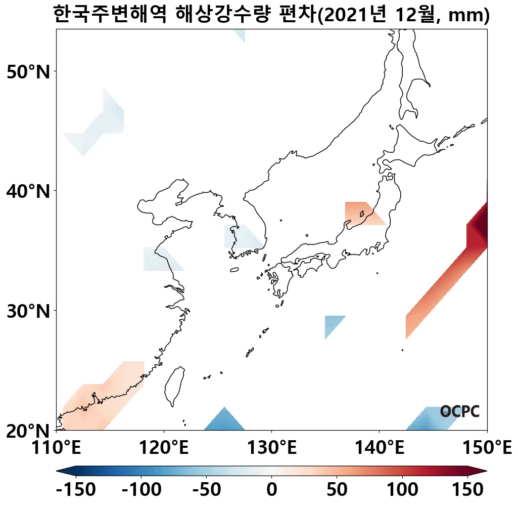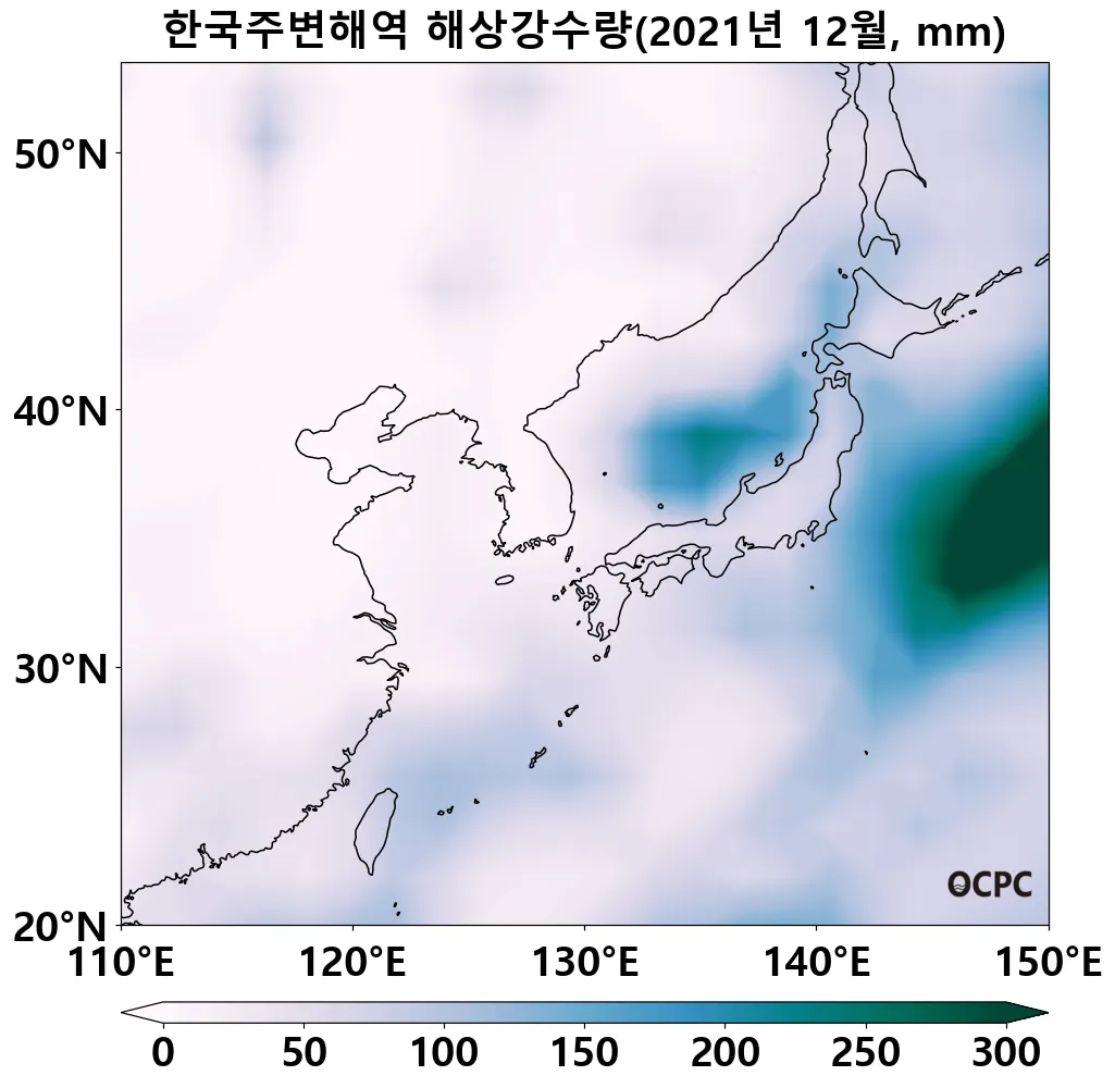 최근 30년 동안 전지구 평균 12월 해상강수량은 10년에 1.2mm씩, 한국주변해역, 동해, 동중국해는 10년에 4.5~6.5mm씩 증가하는 추세이며, 황해는 10년에 0.7mm씩 감소하는 추세입니다.
