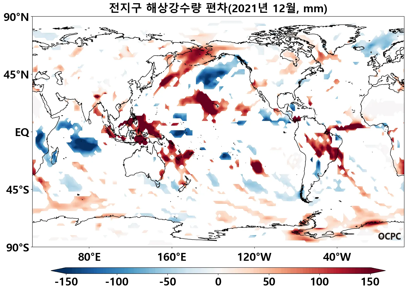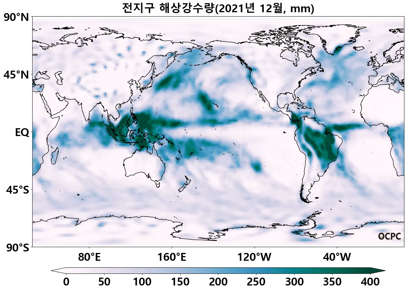 전지구 평균 12월 해상강수량은 평년(93.3mm)과 비슷했습니다.