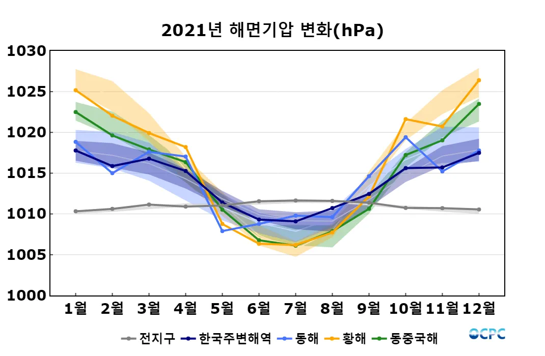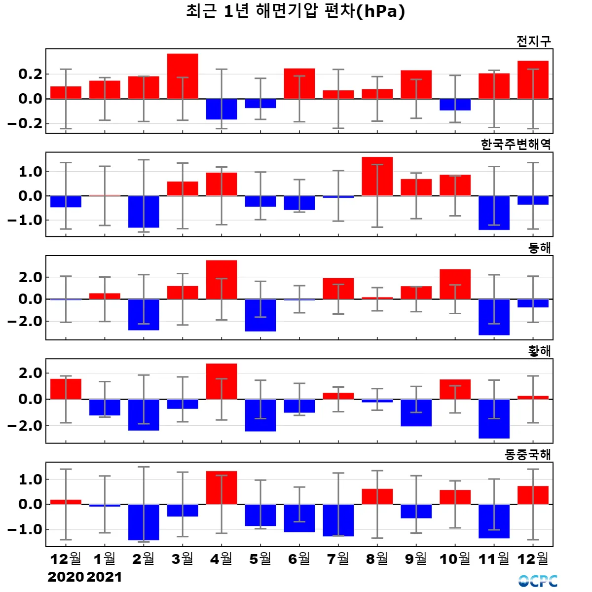 전지구 평균 해면기압은 평년보다 높았으며, 한국주변해역, 동해, 황해, 동중국해는 평년과 비슷했습니다.