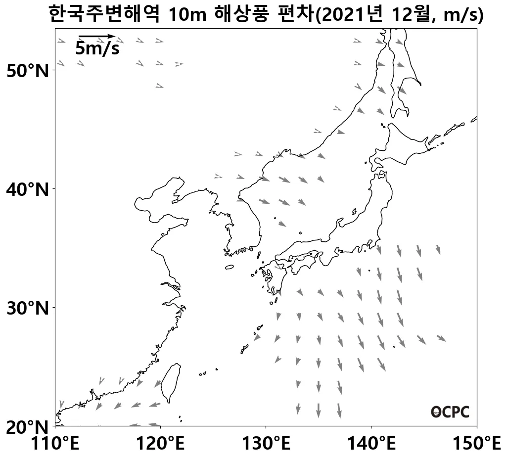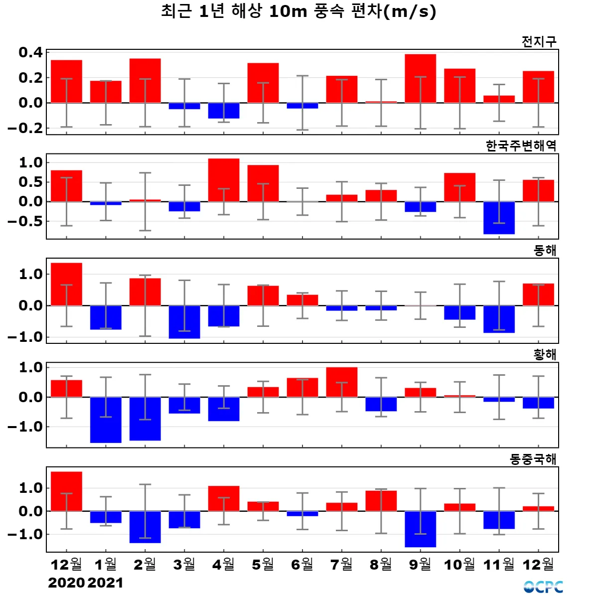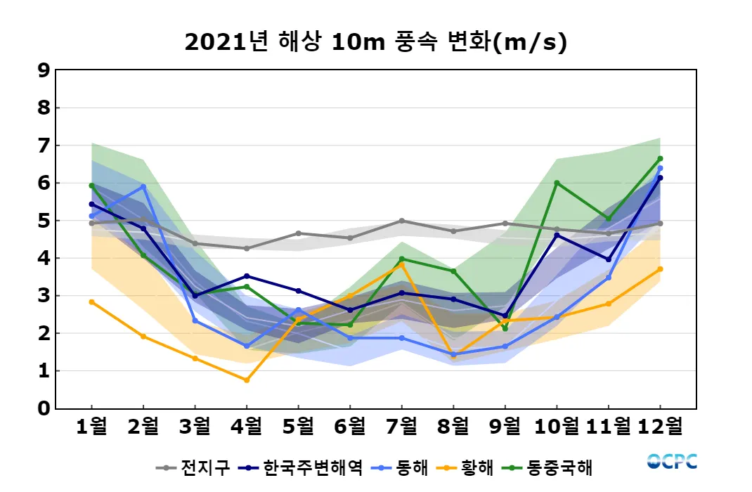 전지구, 동해의 해상풍속은 평년보다 강했으며, 한국주변해역, 황해, 동중국해는 평년과 비슷했습니다.