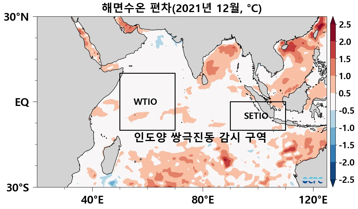 2021년 12월 평균 해면수온의 평년 대비 편차 (숫자가 표시된 사각형은 인도양 쌍극진동 감시구역으로 각각 WTIO(열대서인도양), SETIO(열대 남동인도양) 해역이며, DMI 지수는 WTIO의 평년 대비 편차에서 SETIO의 평년 대비 편차를 뺀 값임)