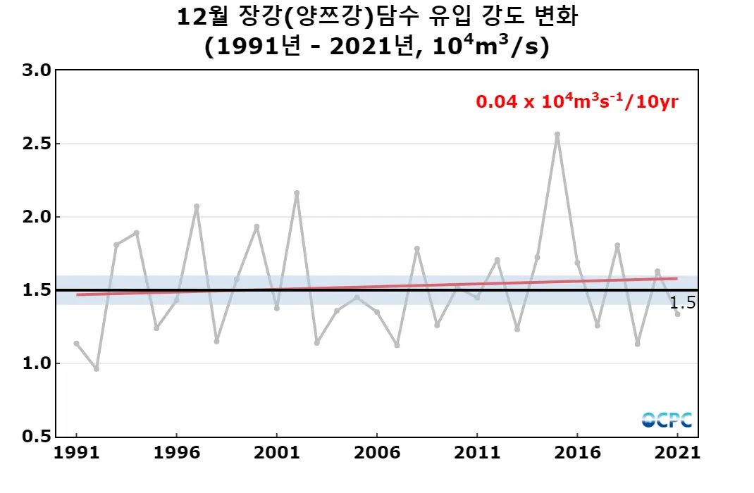 최근 30년 12월 장강 담수 유입 강도는 10년에 약 400m³/s씩(한달간 유입된 담수량으로 환산하면 10년에 약 1기가톤씩) 증가하는 추세입니다.
