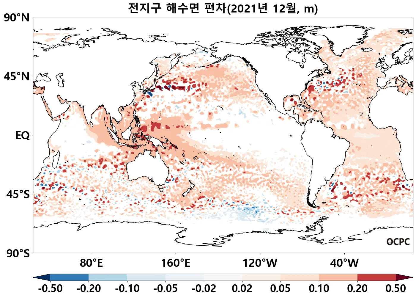 전지구 평균 해수면은 평년보다 5.9cm 높았고, 열대 동태평양 해역과 서인도양 해역을 제외한 대부분의 해역에서 해수면이 상승하였습니다.
