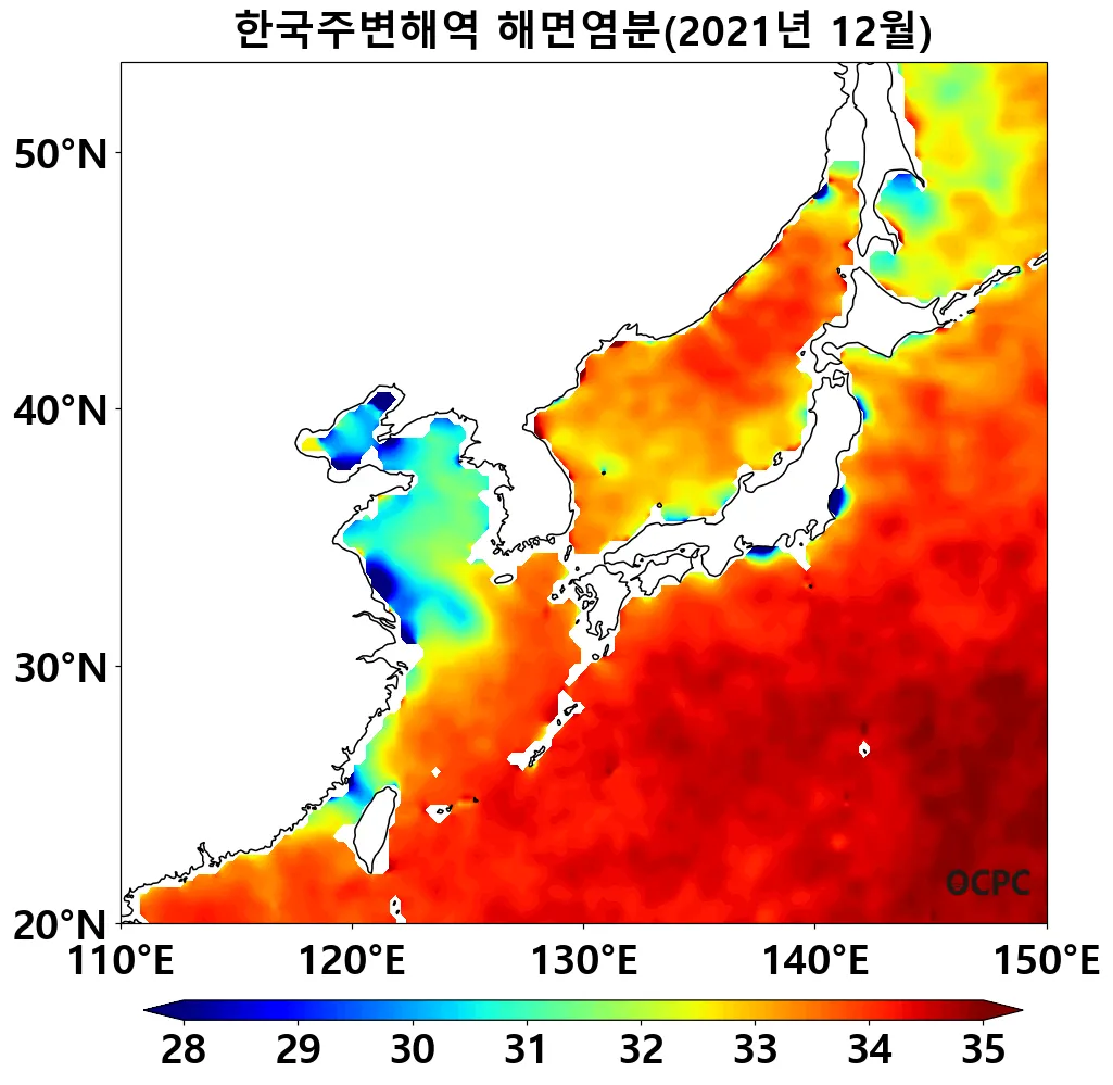인공위성으로 추정한 12월 해면염분 분포에서는 중국 연안에서 낮게 나타났습니다.