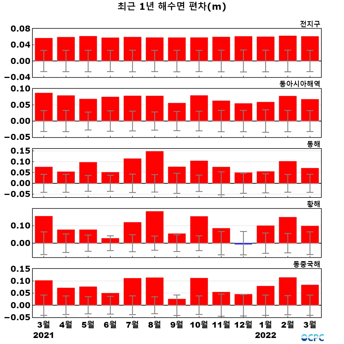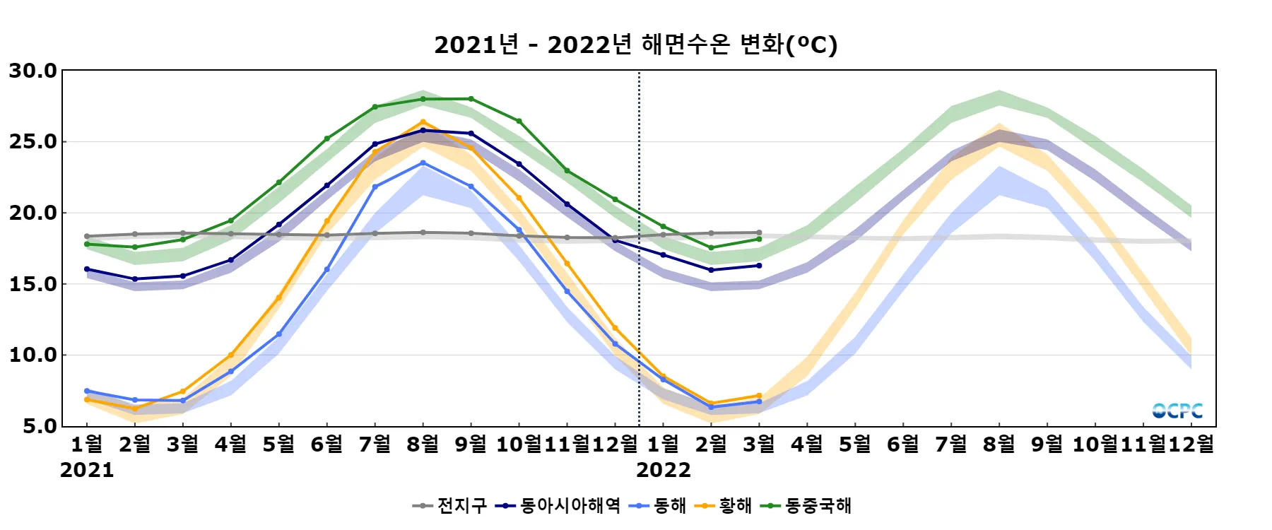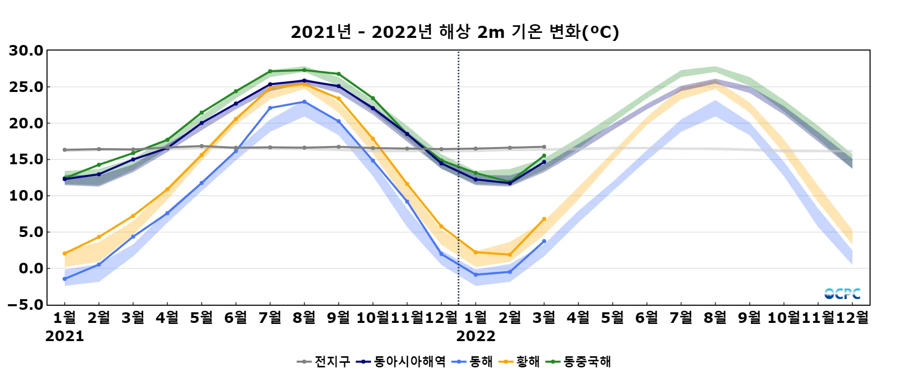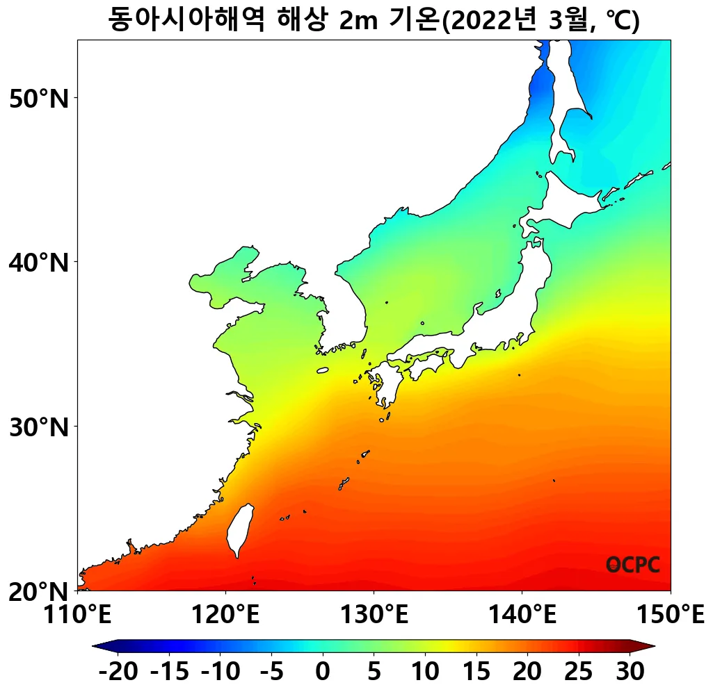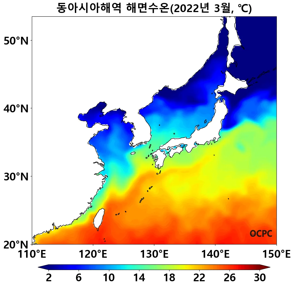 최근 30년 동안 전지구, 동아시아해역, 동해, 황해, 동중국해의 3월 해상기온은 10년에 0.2~0.4°C씩 증가하는 추세입니다.