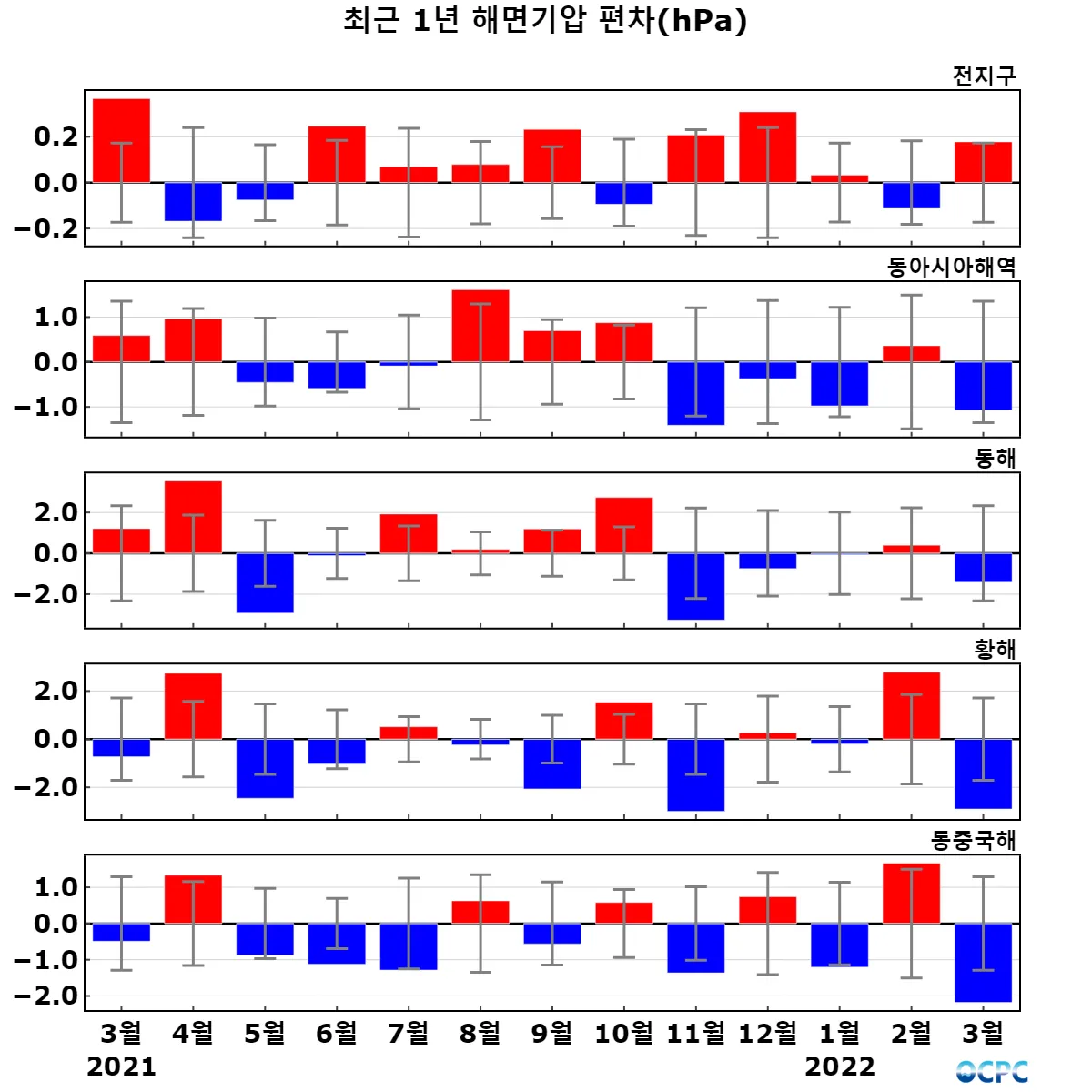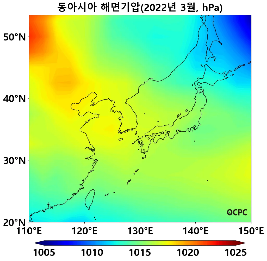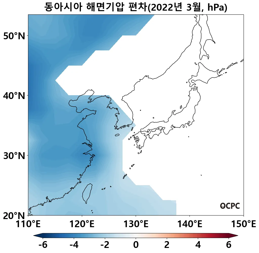 최근 30년 동안 전지구 평균 3월 해면기압은 10년에 0.1hPa씩 증가하는 추세이며, 동아시아해역, 동해, 황해는 10년에 0.1~0.4hPa씩 감소하는 추세입니다.