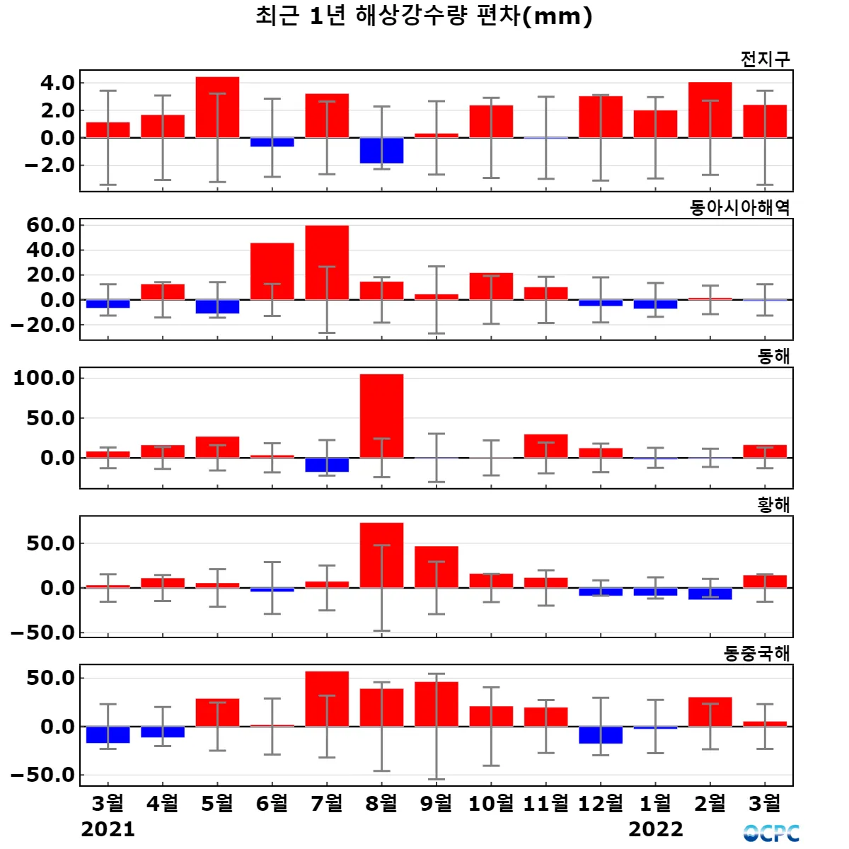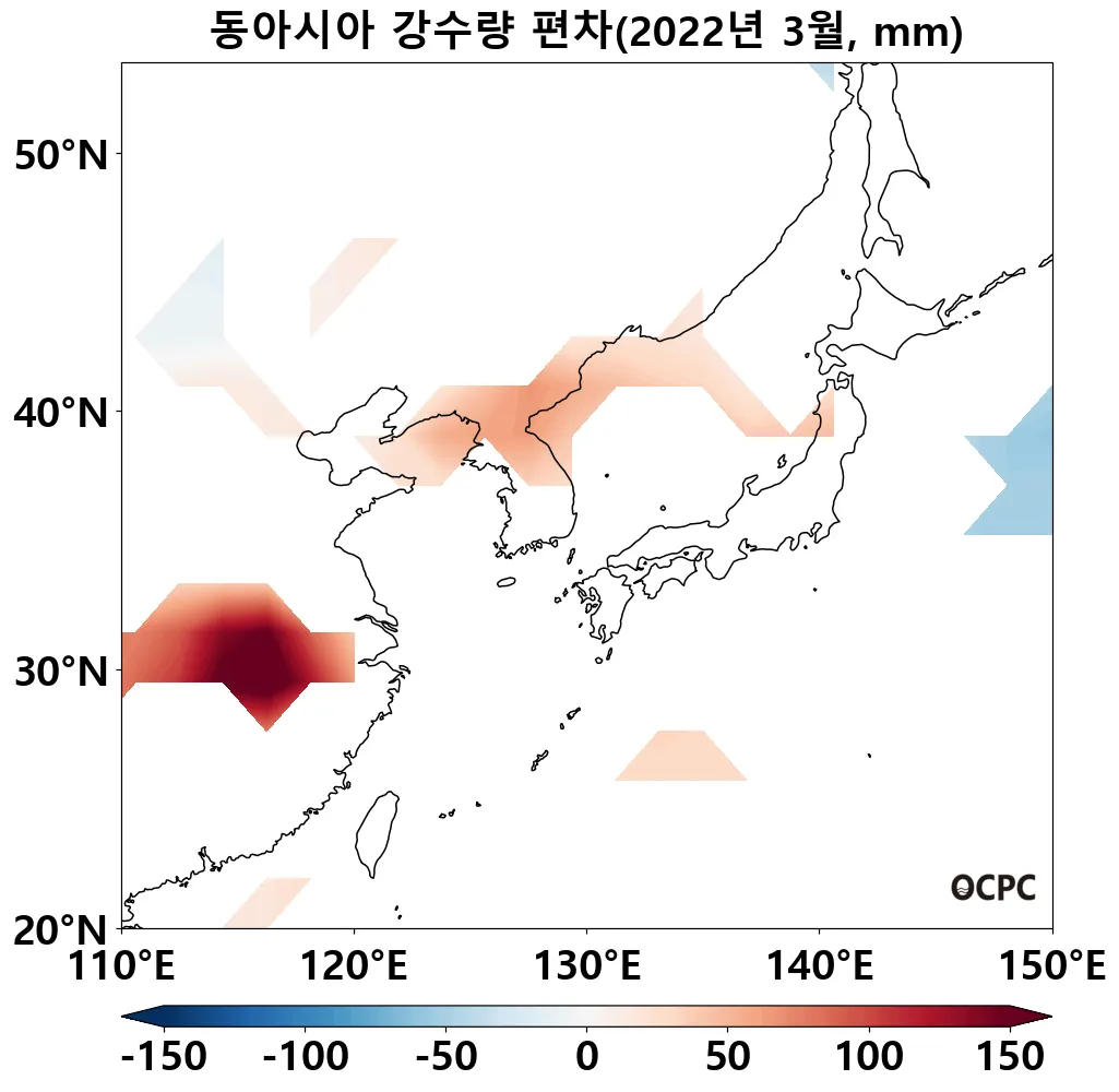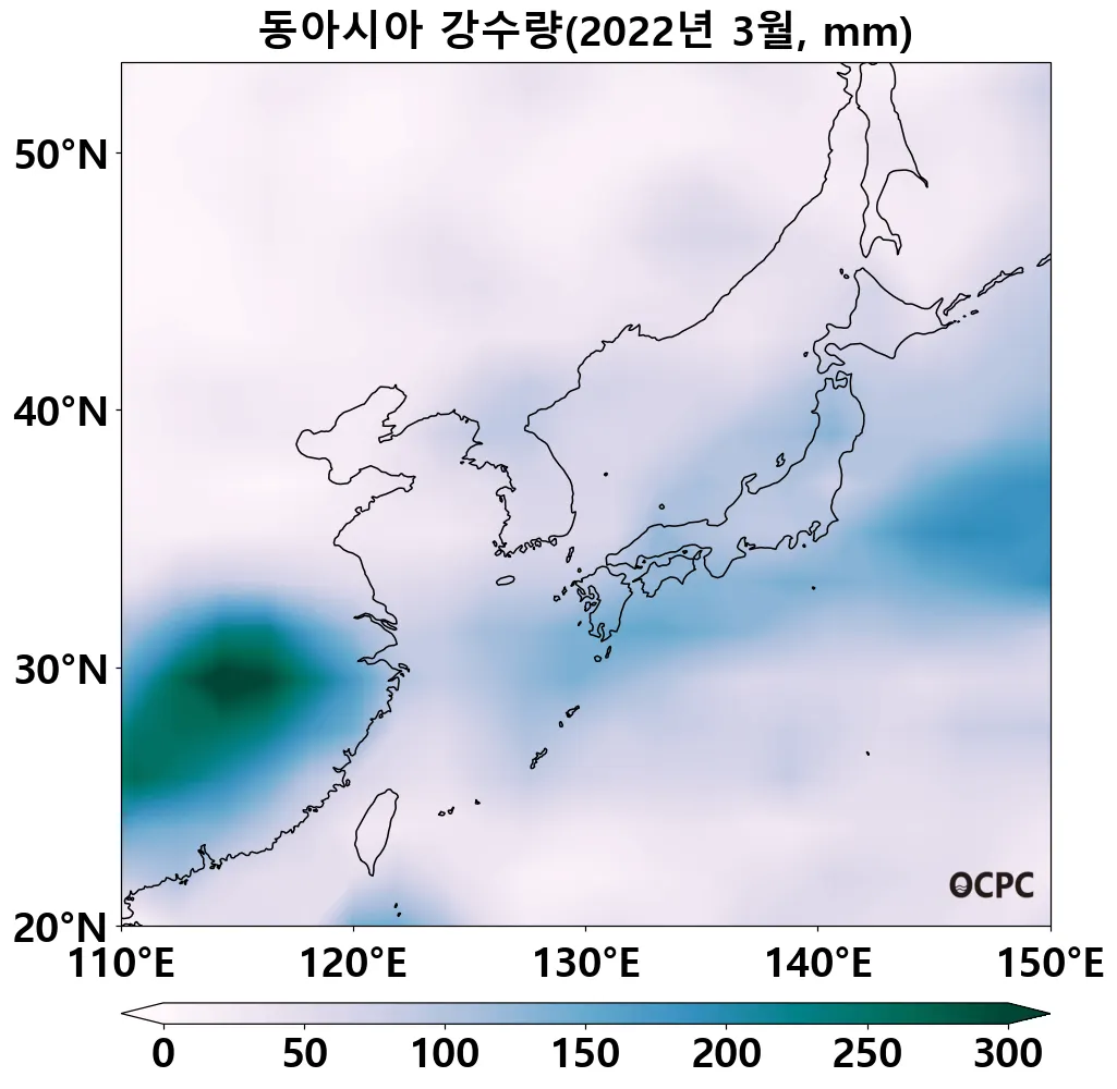 최근 30년 동안 전지구, 동해의 3월 해상강수량은 10년에 0.2~2.6mm씩 증가하는 추세이며, 동아시아해역, 황해, 동중국해는 10년에 1.6~6.8mm씩 감소하는 추세입니다.