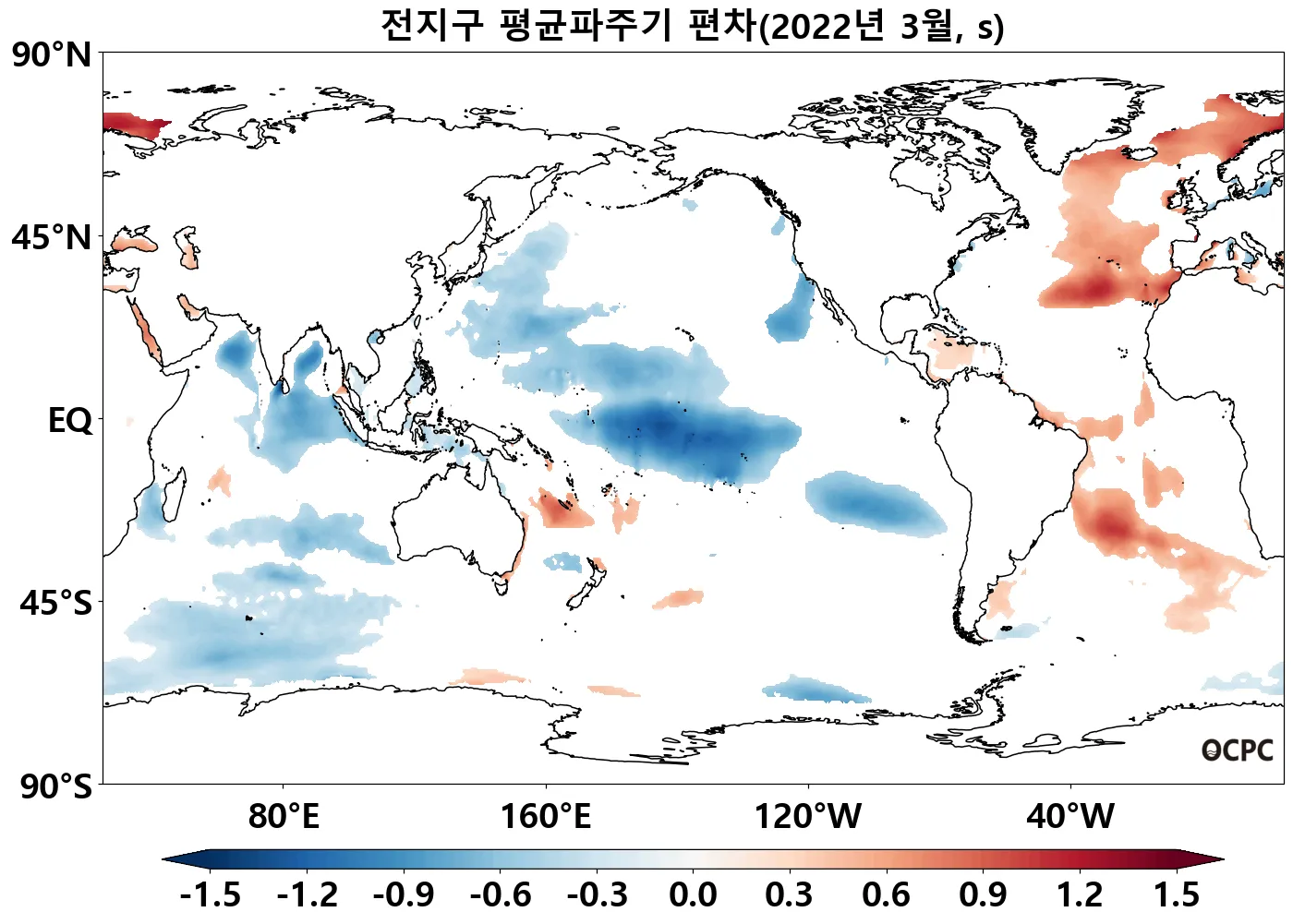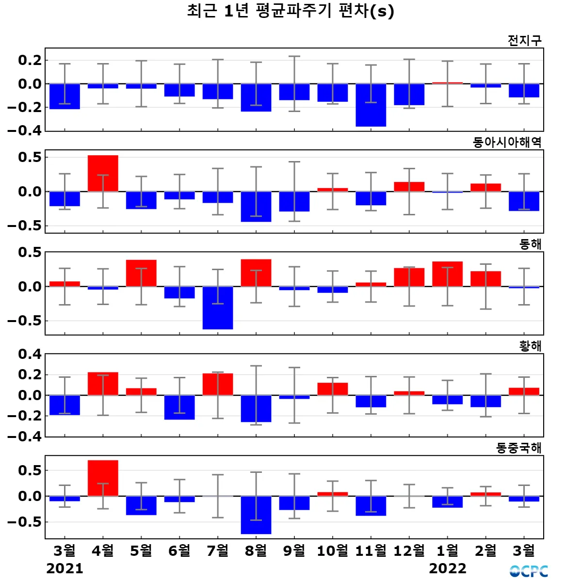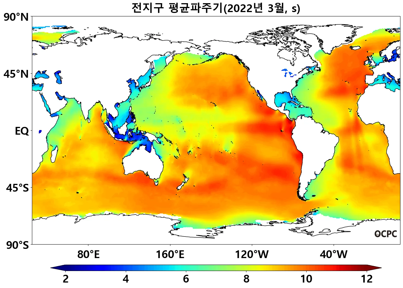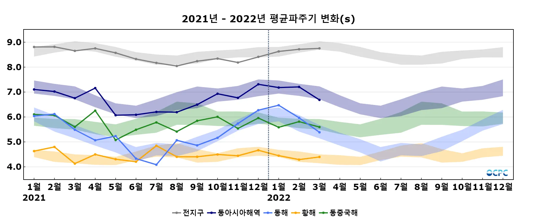 전지구 평균파주기는 평년(8.9초)와 비슷했으며, 동아시아해역은 평년(7.0초)보다 0.3초 짧았습니다.