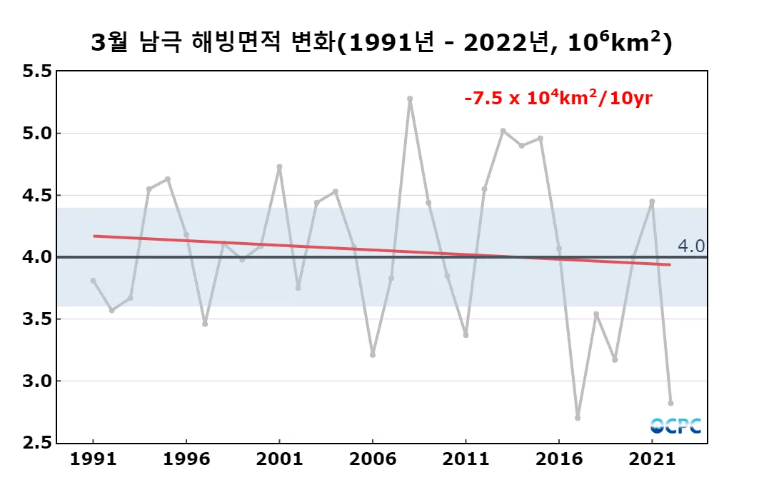 최근 30년 동안 3월 남극 해빙면적 변화 경향은 10년에 7.5만km² 정도로 감소 추세입니다.
