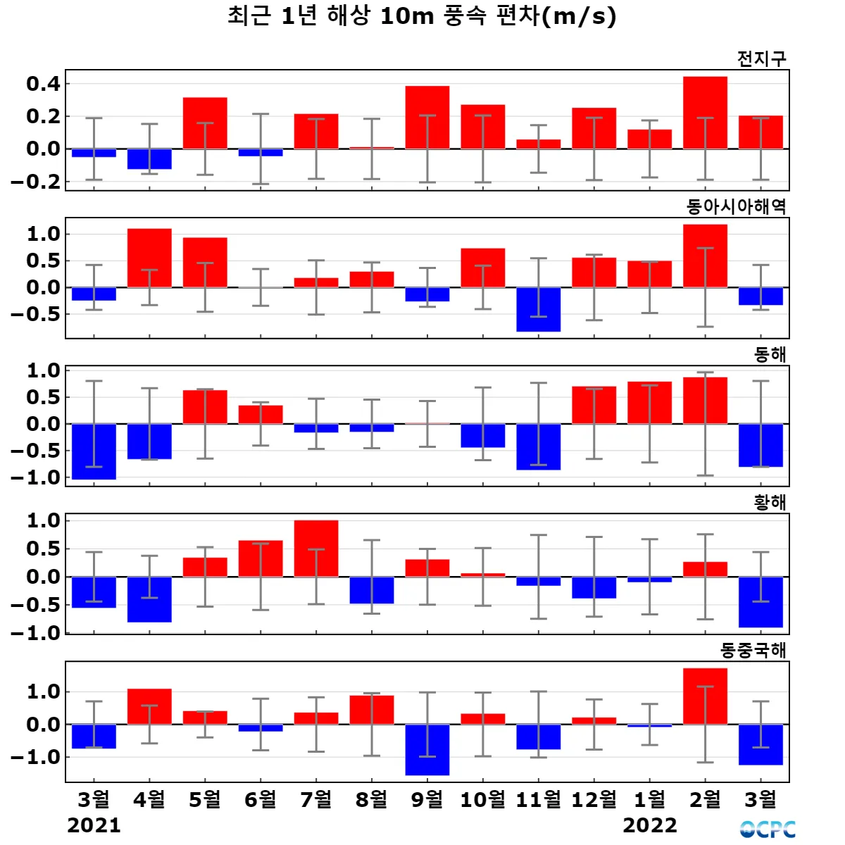 [해상풍] 전지구 평균 해상풍속은 평년보다 4.6% 강했으며, 동아시아해역은 평년과 비슷했고, 동해, 황해, 동중국해는 평년보다 24.0~48.2% 약했습니다.