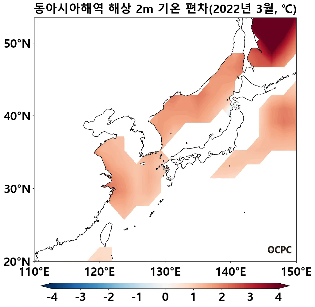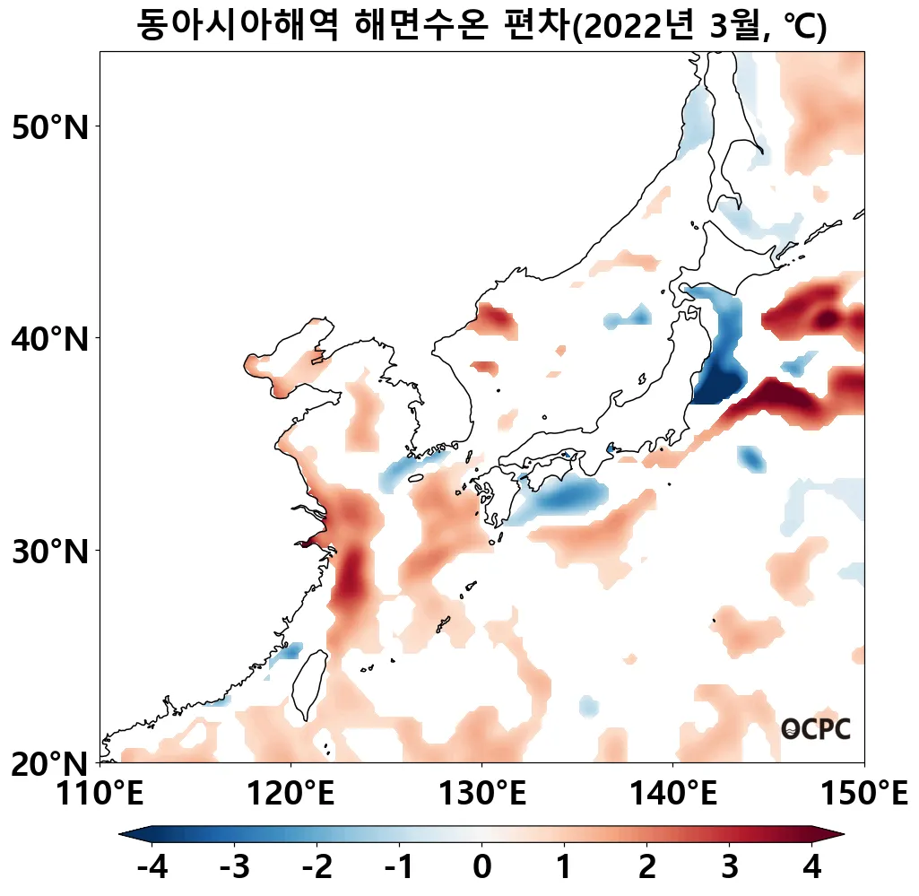 동아시아해역은 평년(14.9°C)보다 1.4°C 높았으며, 지난 30년(3월) 중 가장 높았습니다.