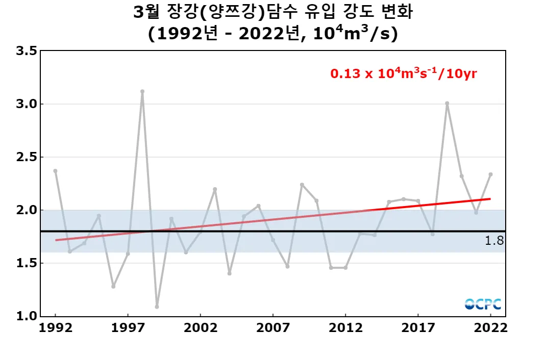 최근 30년 3월 장강 담수 유입 강도는 10년에 1.3톤씩(한달간 유입된 담수량으로 환산하면 10년에 3.5기가톤씩) 증가하는 추세입니다.