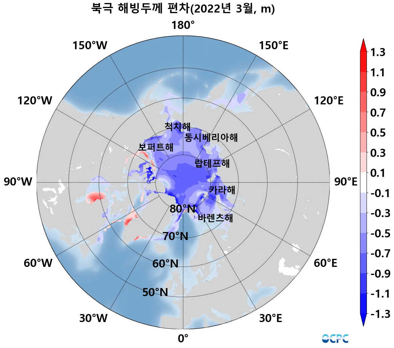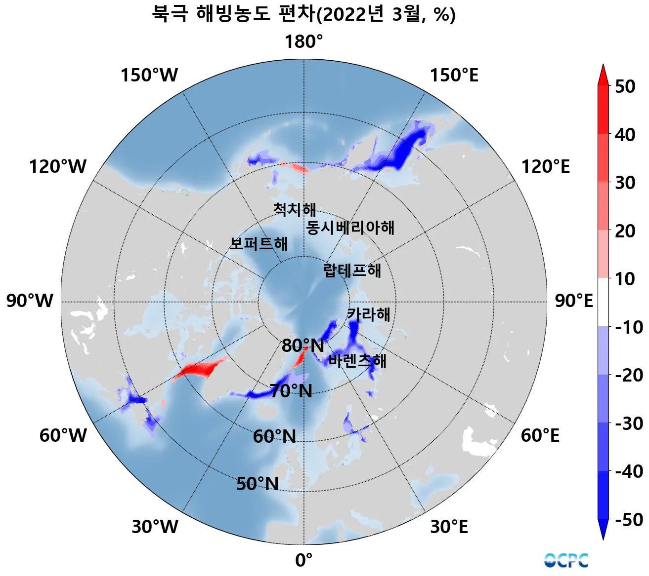 2월 패턴과 유사하게 북미 동안 뉴펀들랜드섬 주변 해역, 그린란드해, 바렌츠해, 오호츠크해의 해빙면적 감소가 평년보다 컸습니다.