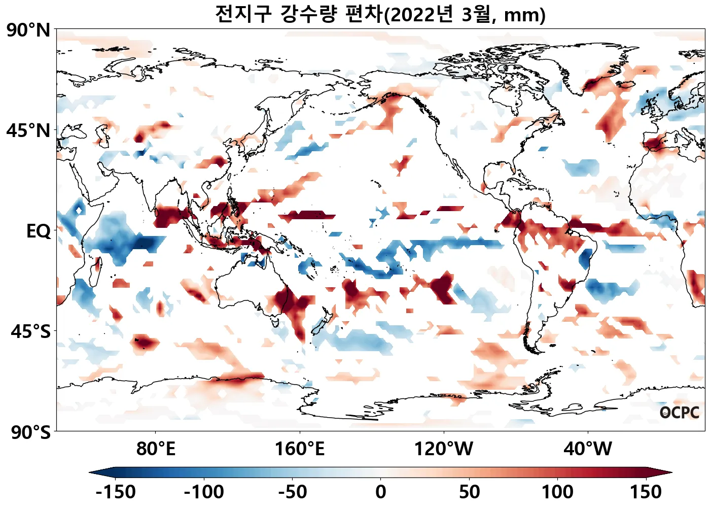 전지구 평균 3월 해상강수량은 평년(90.1mm)과 비슷했습니다.