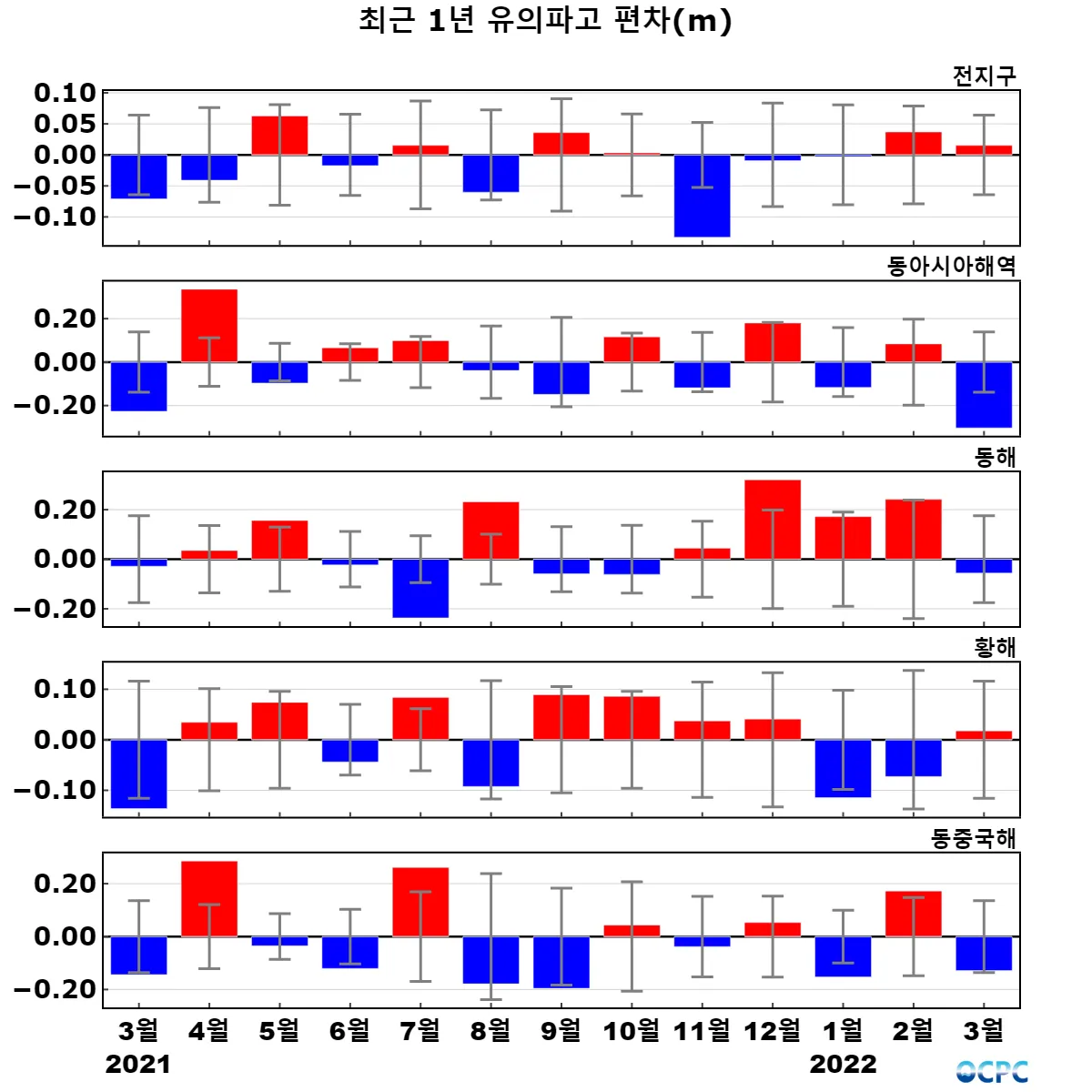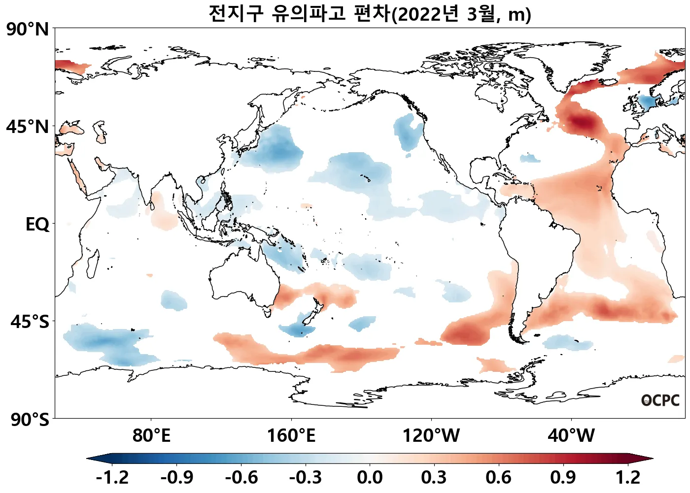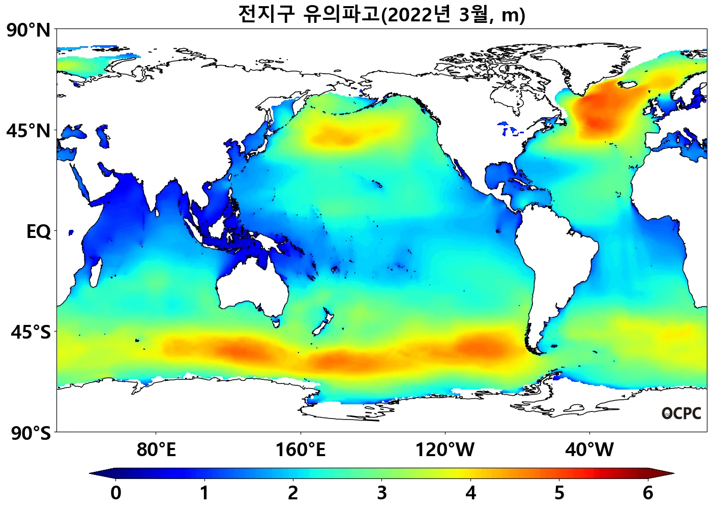 전지구 평균 유의파고는 평년(2.6m)과 비슷했습니다.