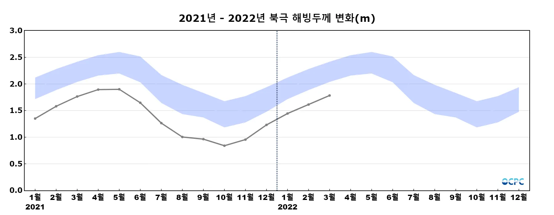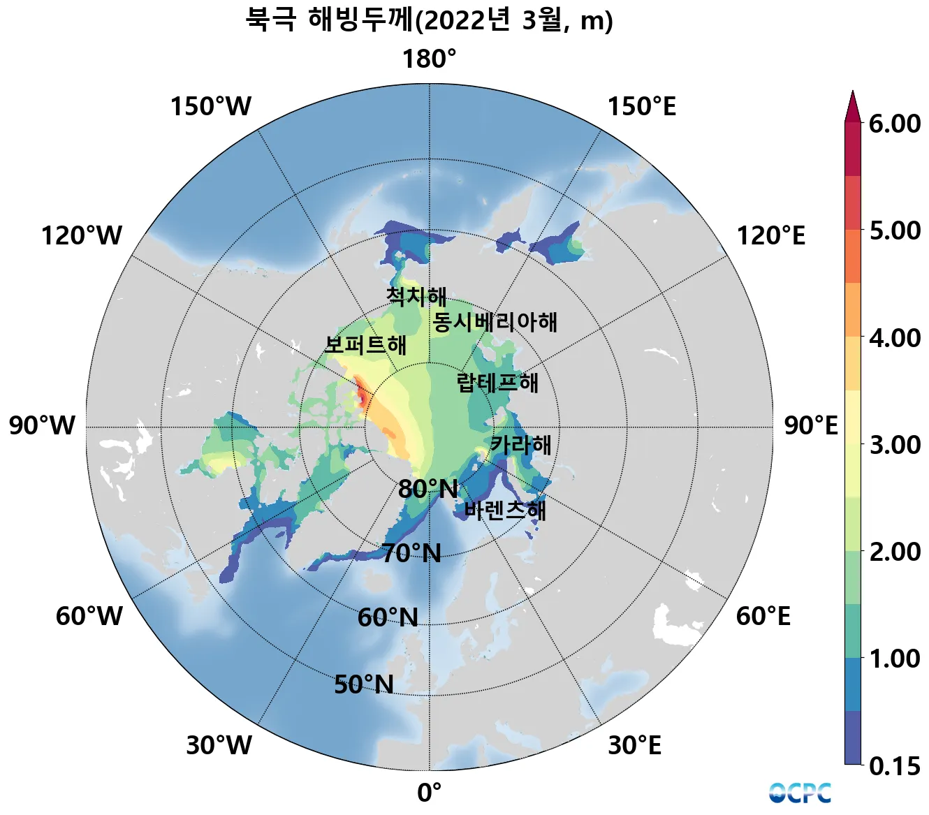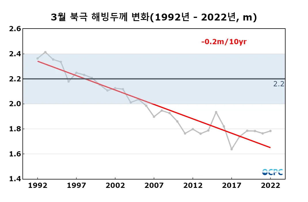 북극 해빙두께는 평년(2.2m)보다 약 0.4m(20%) 얇았으며, 최근 30년 동안 10년에 0.2m씩 얇아지는 추세입니다.
