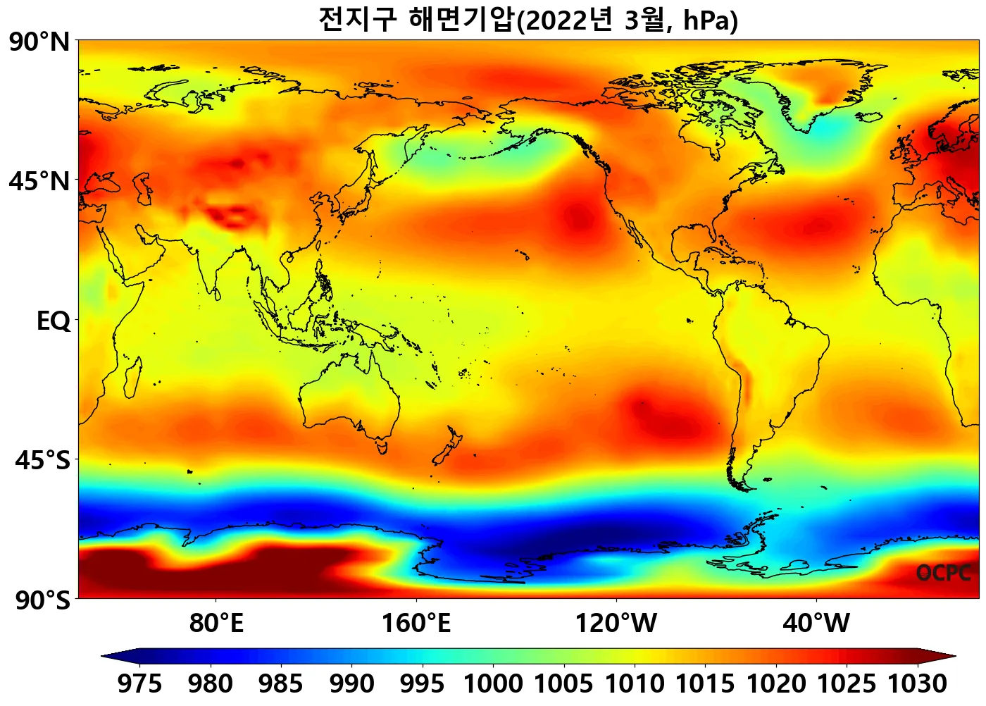 전지구 평균 해면기압은 평년(1010.8hPa)보다 0.2hPa 높았습니다.