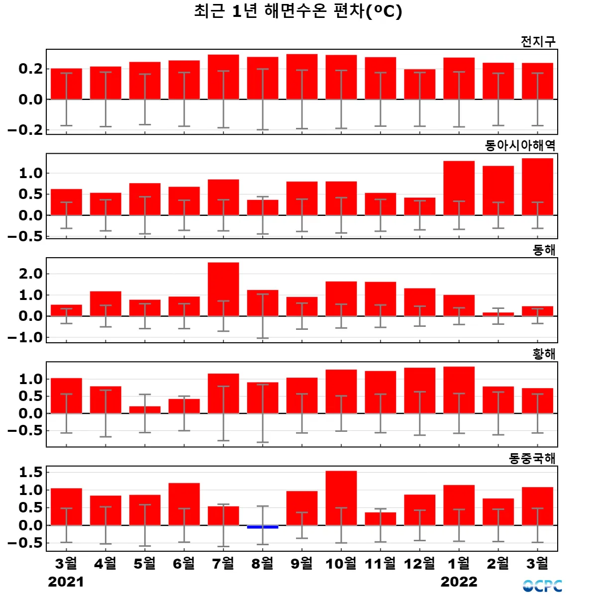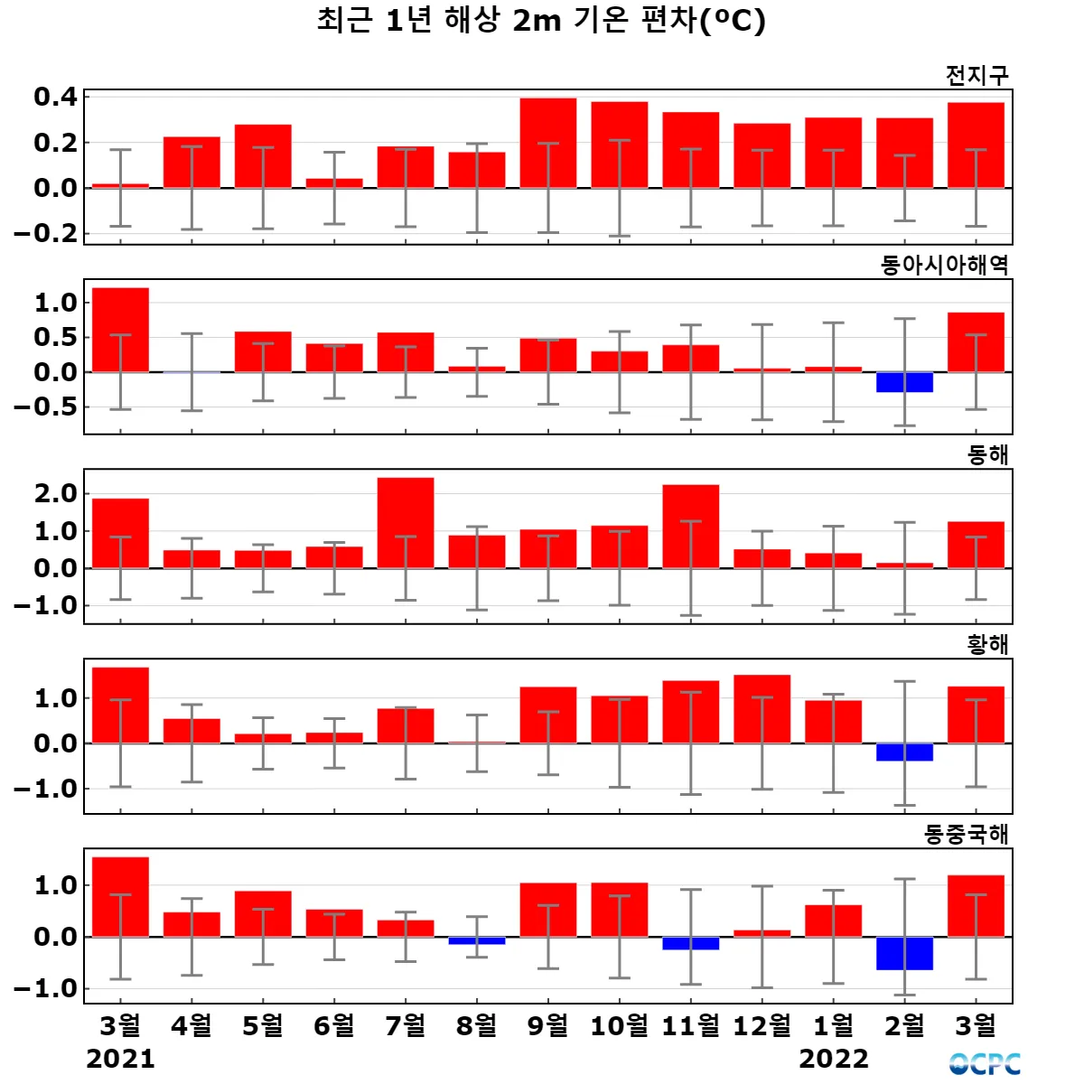 동해, 황해, 동중국해의 해상기온은 평년(2.5°C, 5.6°C, 14.3°C)보다 1.3°C, 1.3°C, 1.2°C 높았습니다.