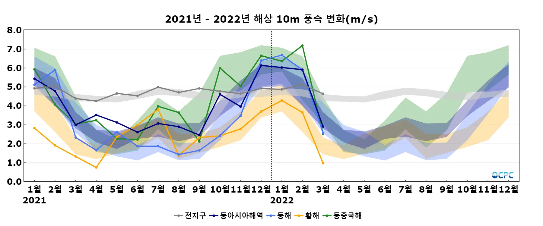 동해, 황해, 동중국해의 해상풍속은 평년(3.4m/s, 1.9m/s, 3.8m/s)보다 0.8m/s(24.0%), 0.9m/s(48.2%), 1.3m/s(33.1%) 약했습니다.