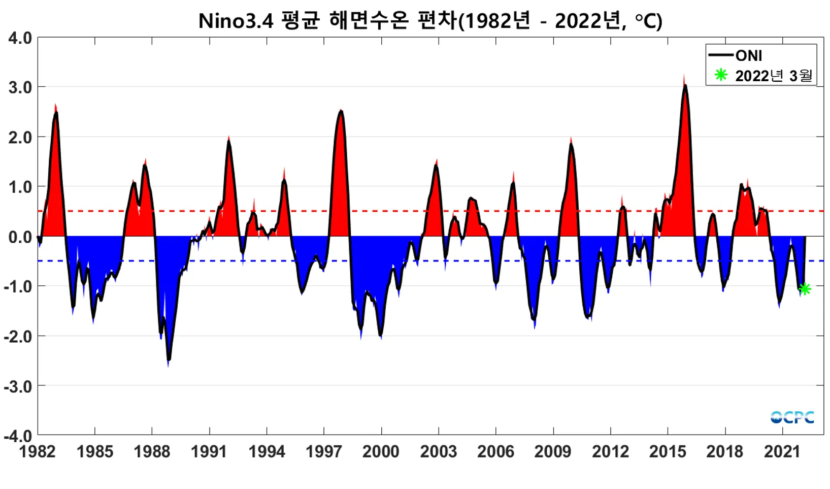 ONI (Ocean Nino Index): 엘니뇨/라니냐 감시구역인 Nino3.4 해역의 월평균 해면수온 편차(채색부분)를 3개월 이동평균하여 나타낸 지수(검정선)로 0.5보다 크면 엘니뇨, -0.5보다 작으면 라니냐로 판정합니다.