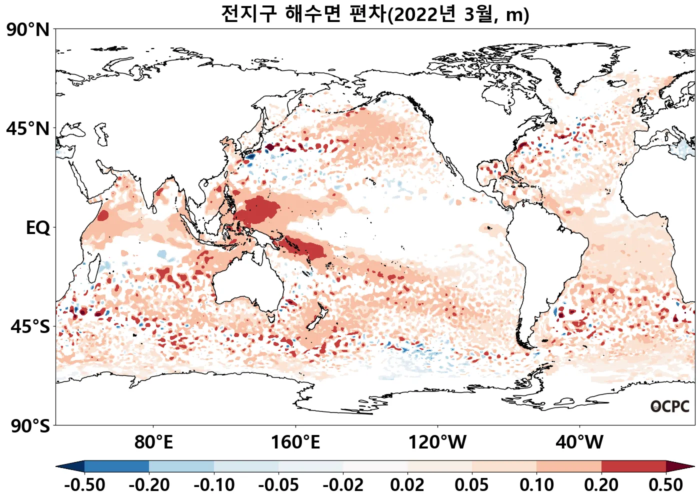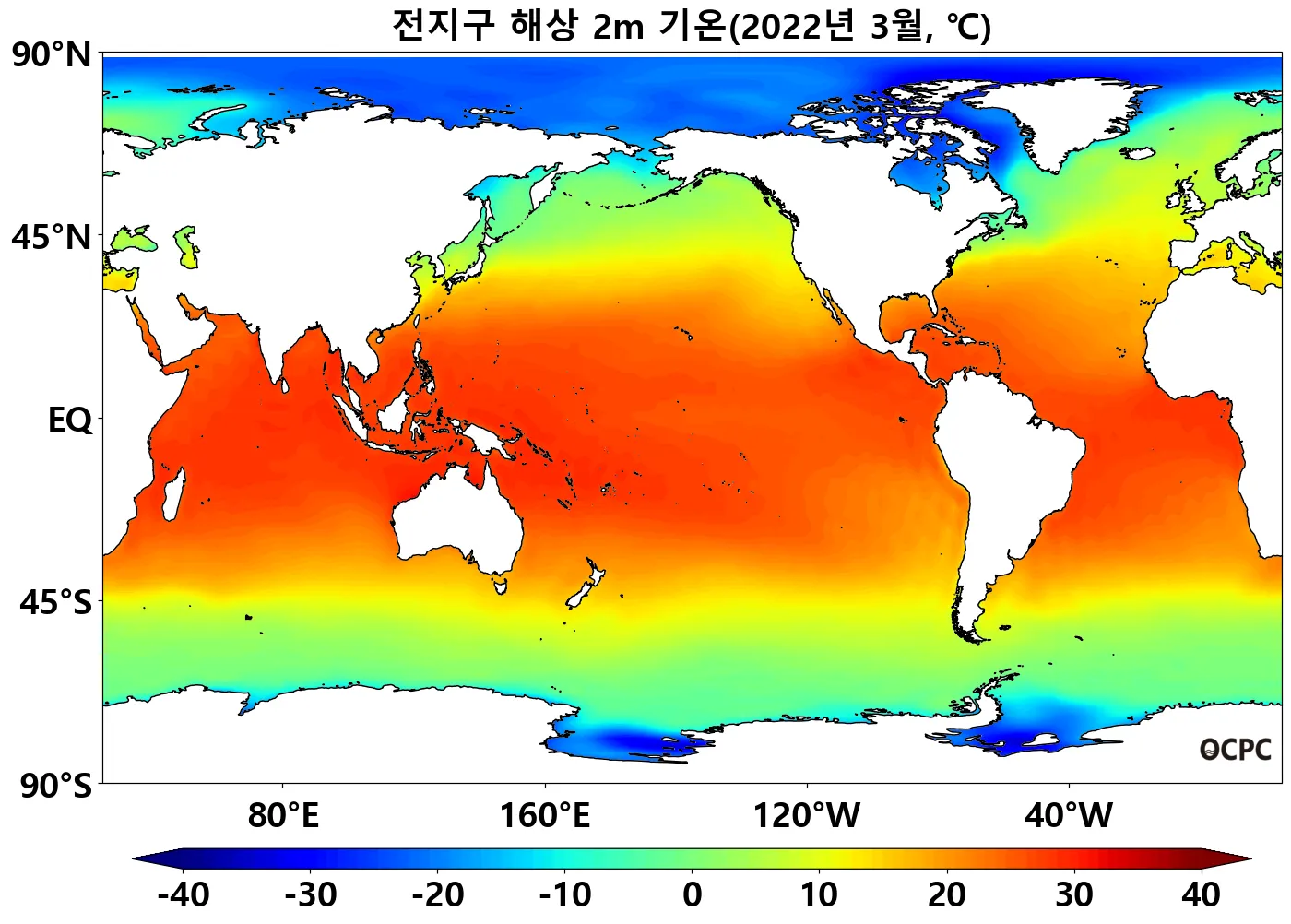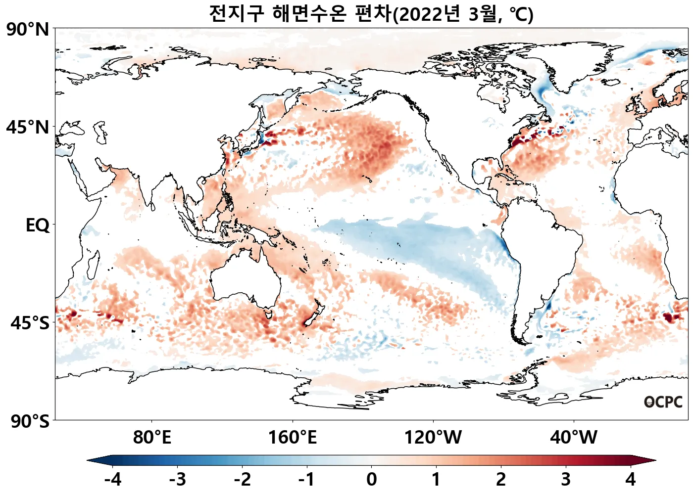 중위도 태평양(30°N~45°N, 30°S~45°S)은 평년보다 높은 반면 열대 동태평양(0~30°S)은 낮았습니다.